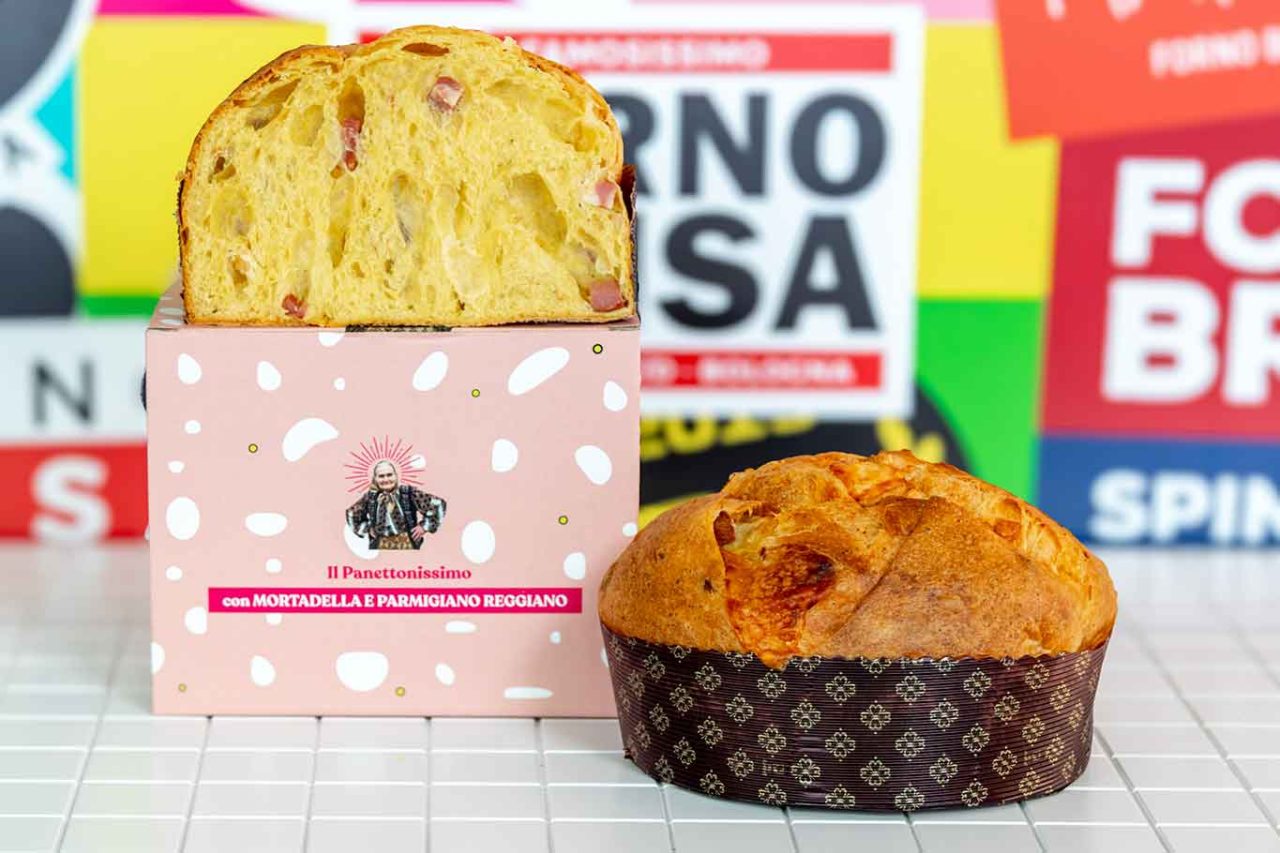 Ma restiamo in tema con il panettone salato. Con il panettone piuù bolognese di tutti, nato come omaggio alla città: Mortadella e Parmigiano Reggiano. Nel formato di 900 grammi.