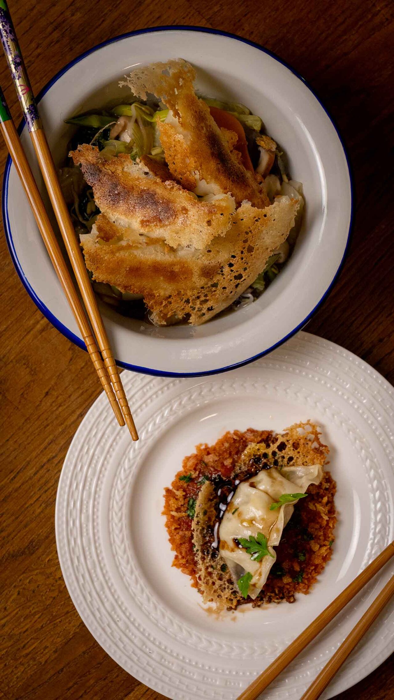 A questo punto, distribuire il riso nelle ciotole e versarvi sopra il composto di verdure adagiando i gyoza croccanti di Yoji Tokuyoshi.