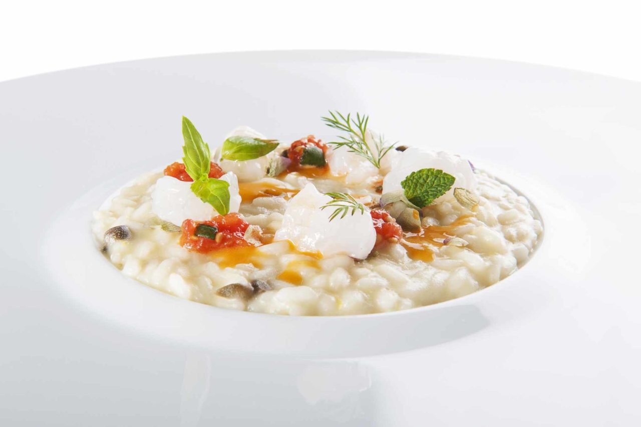 Ancora mare in tavola con il Risotto con gamberi di Sanremo, pomodori pugliesi e capperi.