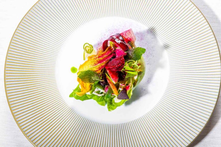 A seguire una purea di topinambur su cui poggia, delicata, una stracciatella pugliese. A completare una foglia di basilico e un filo d’olio.