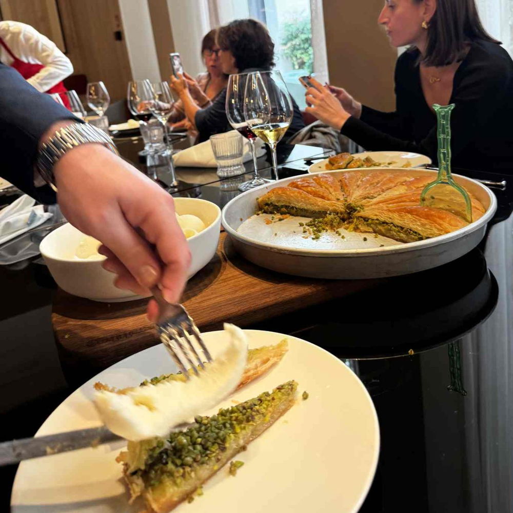 Anche la Baklava al ristorante di Salt Bae a Milano viene servita e porzionata al tavolo (18 €). Si tratta dell’unico dolce in carta, ricco di miele e frutta secca (specie pistacchi di Antep). Dolce naturalmente turco, ma di origini ottomane, piacevole variante rispetto ai classici dolci italici.