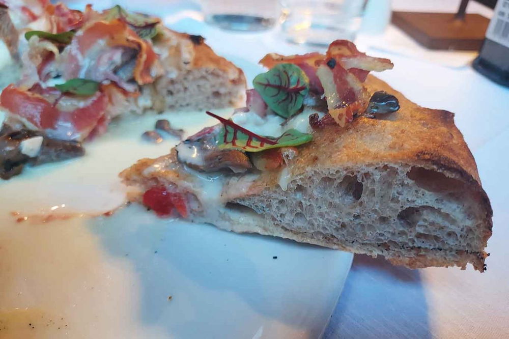 La carta de La Plume, infatti, divide tra “pizza all’italiana” e “Fermenti di grano”. Se la prima è l’interpretazione veneta del disco di pasta, la seconda è il frutto della creatività e del “manico” di Antonio. Un’accurata miscela di grano, farro, grano saraceno e lievito madre, dà vita così ad una base alta e fragrante, servita in spicchi.