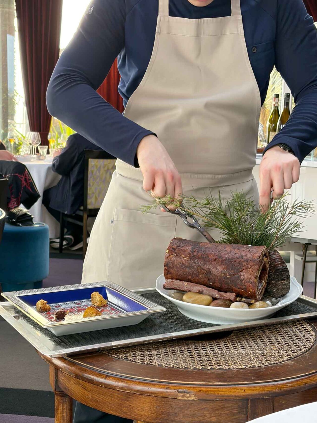 E, ultima portata salata, una bavette di manzo, taglio di carne di pancia, con grasso d’anatra, sangue di rilascio, lardo e con bucce di nebbiolo affinata nel Testun di pecora. Tante carni animali in un unico piatto.