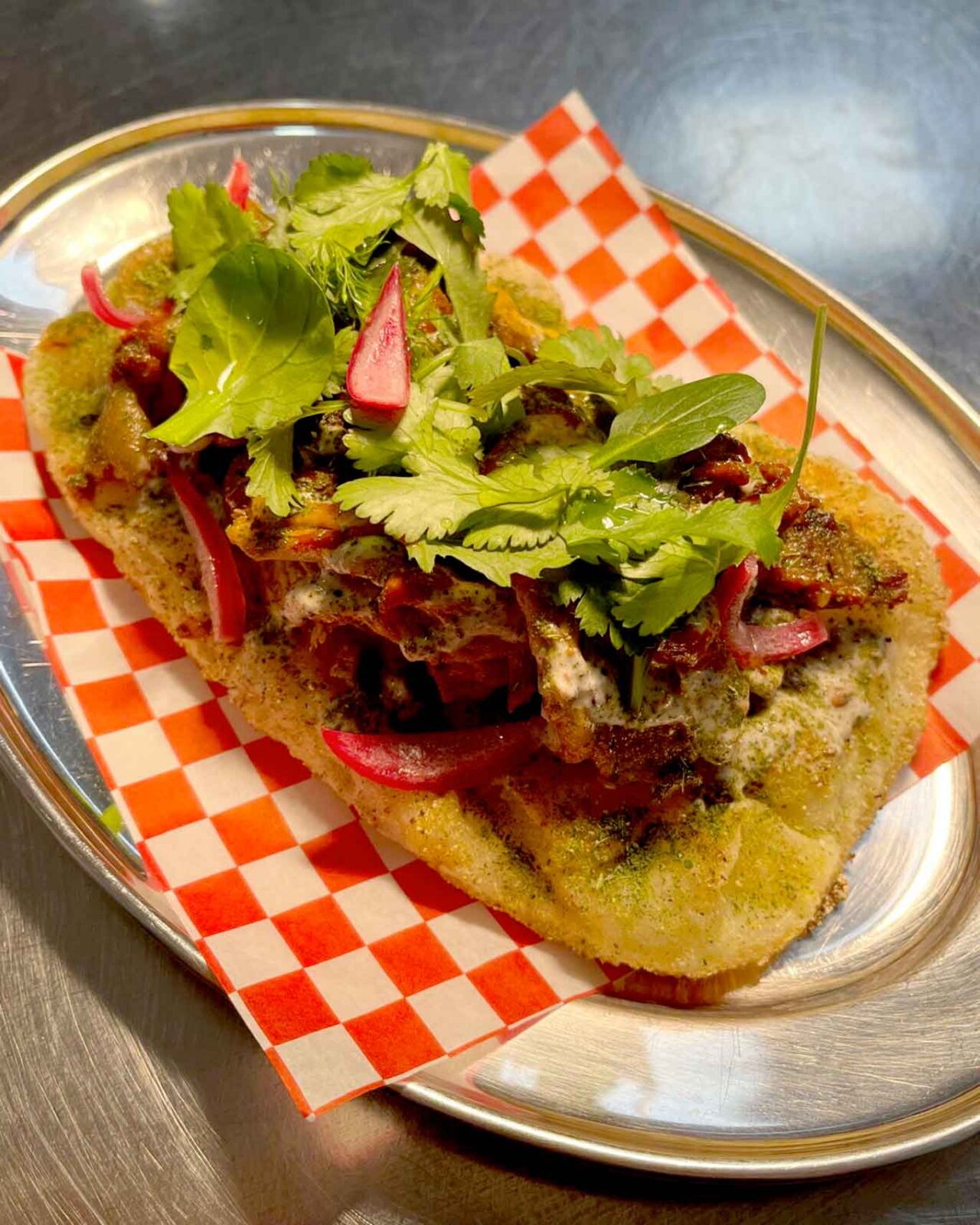 Il Flatbread normalmente è servito con prosciutto crudo semibrado ma qui lo vedete con pollo alla cacciatora sfilacciato, olive, puntarelle e yogurt a guarnire il tutto (16 euro).