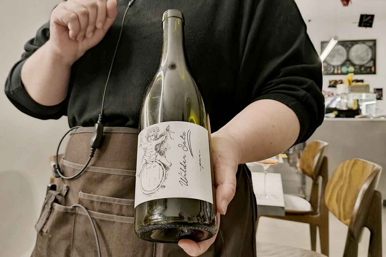 Abbinamento con il vino Wilder Satz in un connubio riuscito tra acidità, sapori forti ed equilibri inaspettati. Wilder Satz è un biodinamico reniano molto particolare. È un un blend di campo, una raccolta simultanea di tutte uve a bacca bianca, tipiche della zona, i classici Kerner, Riesling, Muller. Come spiega la sommelier: “come passaggio è importante la breve fermentazione sulle fecce, che gli dà un leggero spunto acidulo, caratteristico anche del Riesling. Lo serviamo con la fregola perché la scapece di cozze ha una piccola nota acetica”.