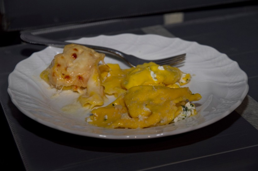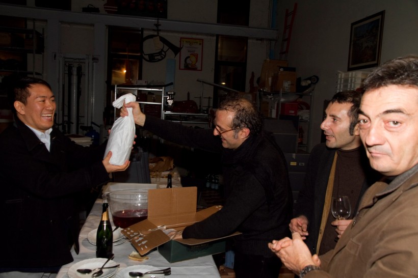Si è mangiato (benissimo, che catering ragazzi!) tortellini, tortelloni, pasta e patate, porchetta a rotolo, prosciutti, gnocco fritto (grazie Ermes che hai contribuito ad alzare la mia quantità di strutto in circolo). E poi Lambrusco. E champagne.
