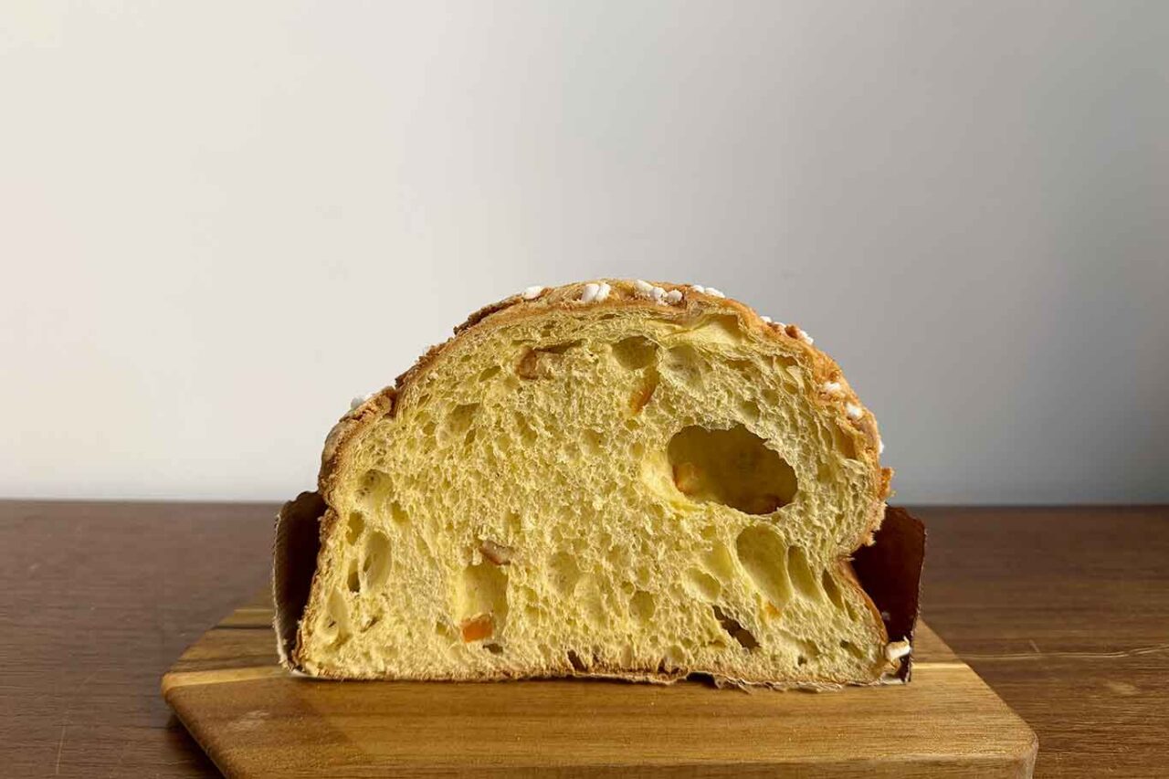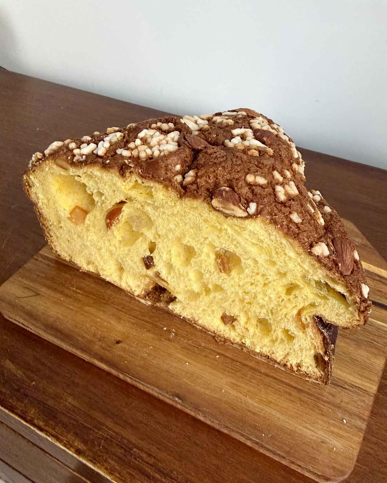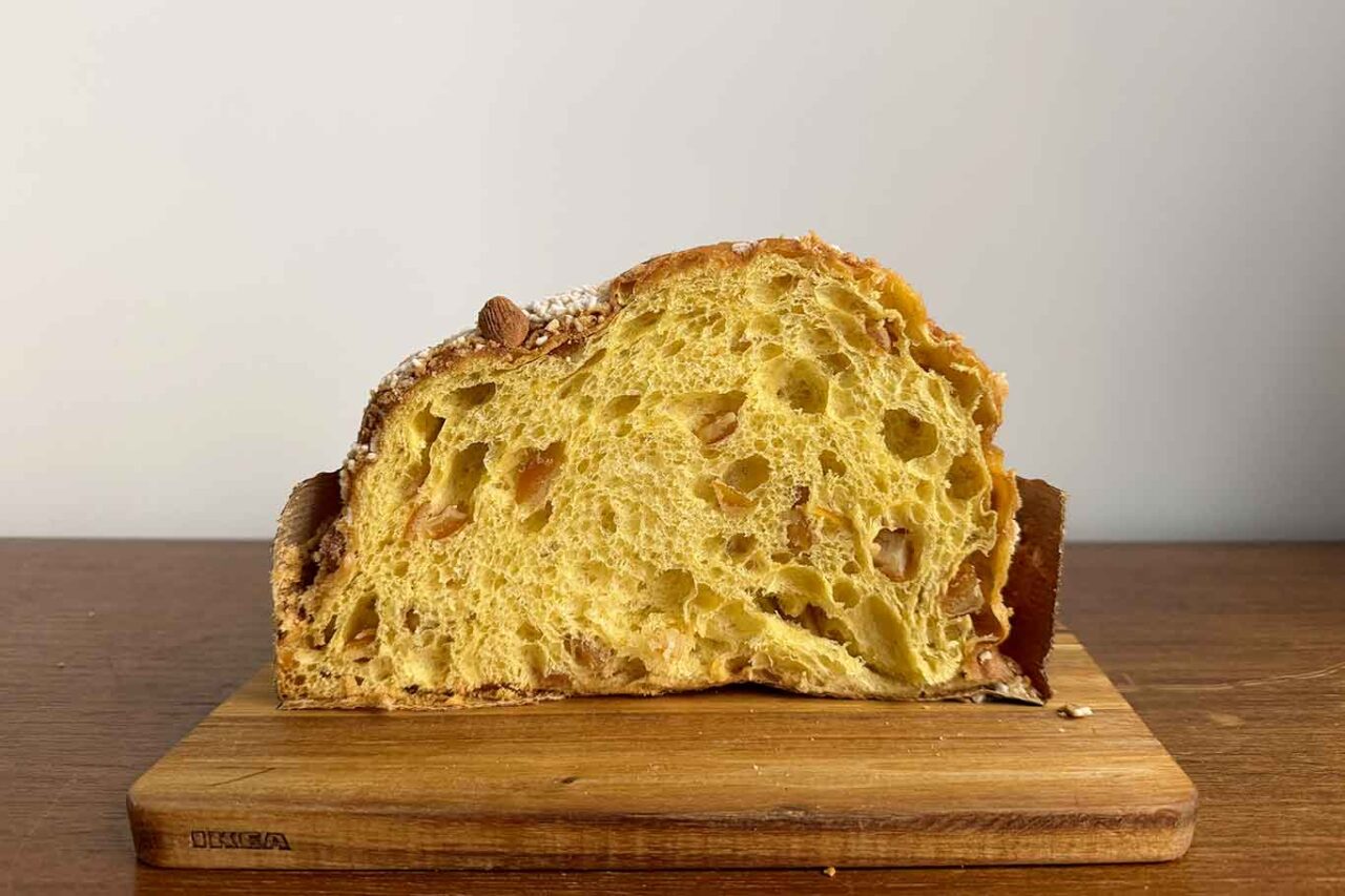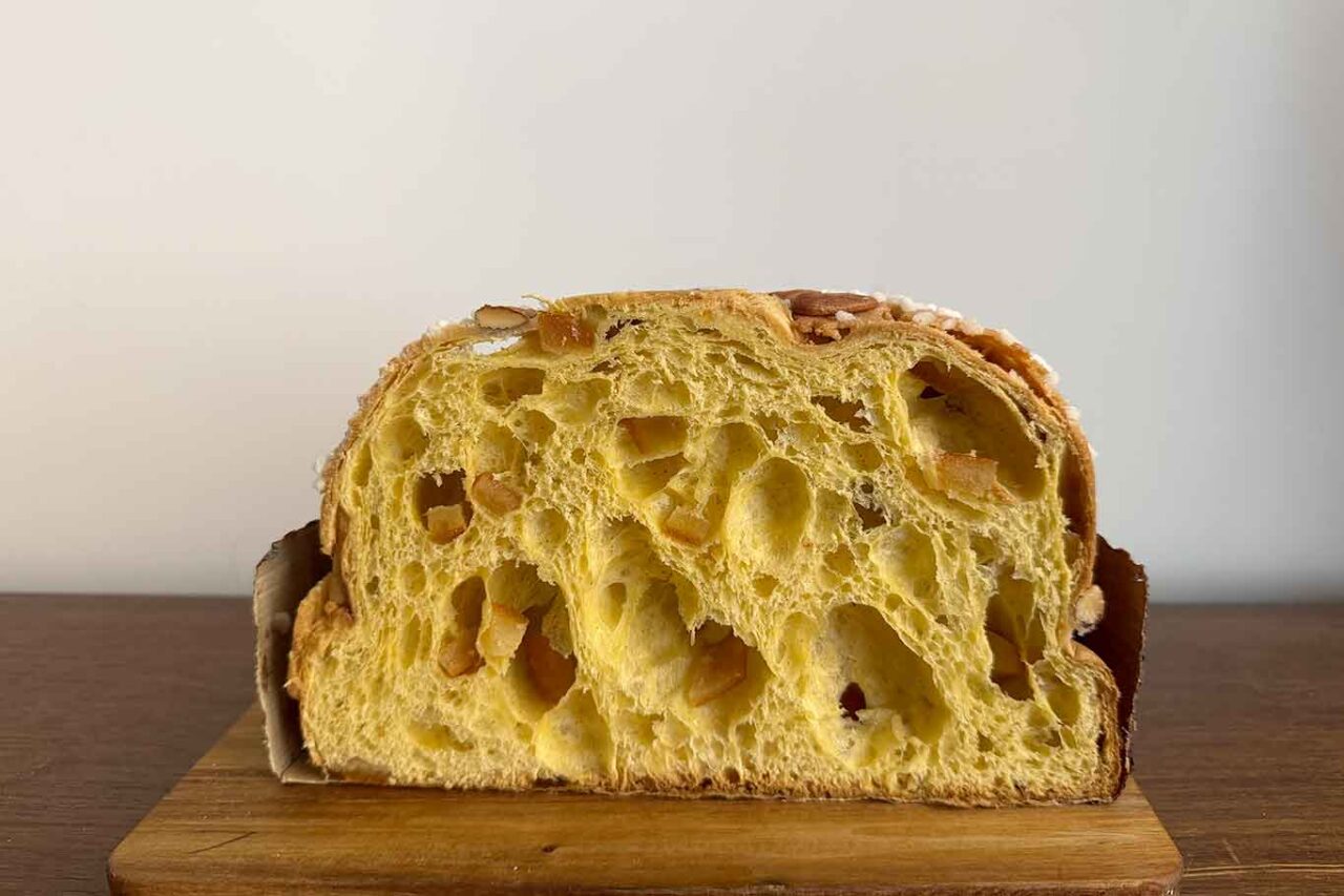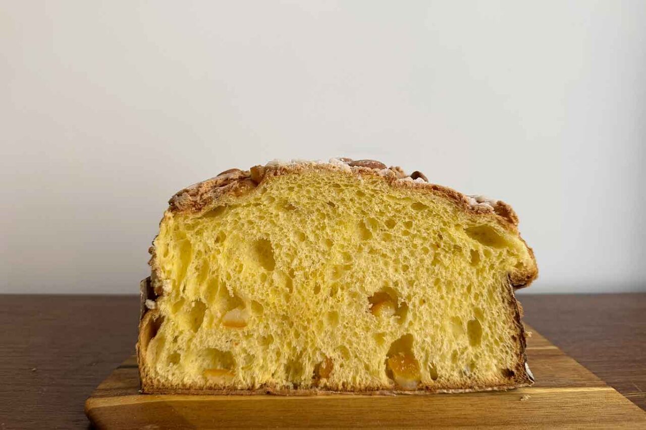 La struttura è impeccabile, come da tradizione: equilibri di sapori misurati, un profilo aromatico nitido e una delicata nota agrumata affidata ai cubetti di scorza d’arancia, distribuiti purtroppo soprattutto sul fondo. L’impasto si distingue per una soffice eleganza, dalla texture intrigante e ben definita, frutto di una lavorazione complessa che prevede quattro lievitazioni e due impasti, per un totale di 65 ore. Un lavoro tecnico che si percepisce nella leggerezza e nella regolarità della trama interna.