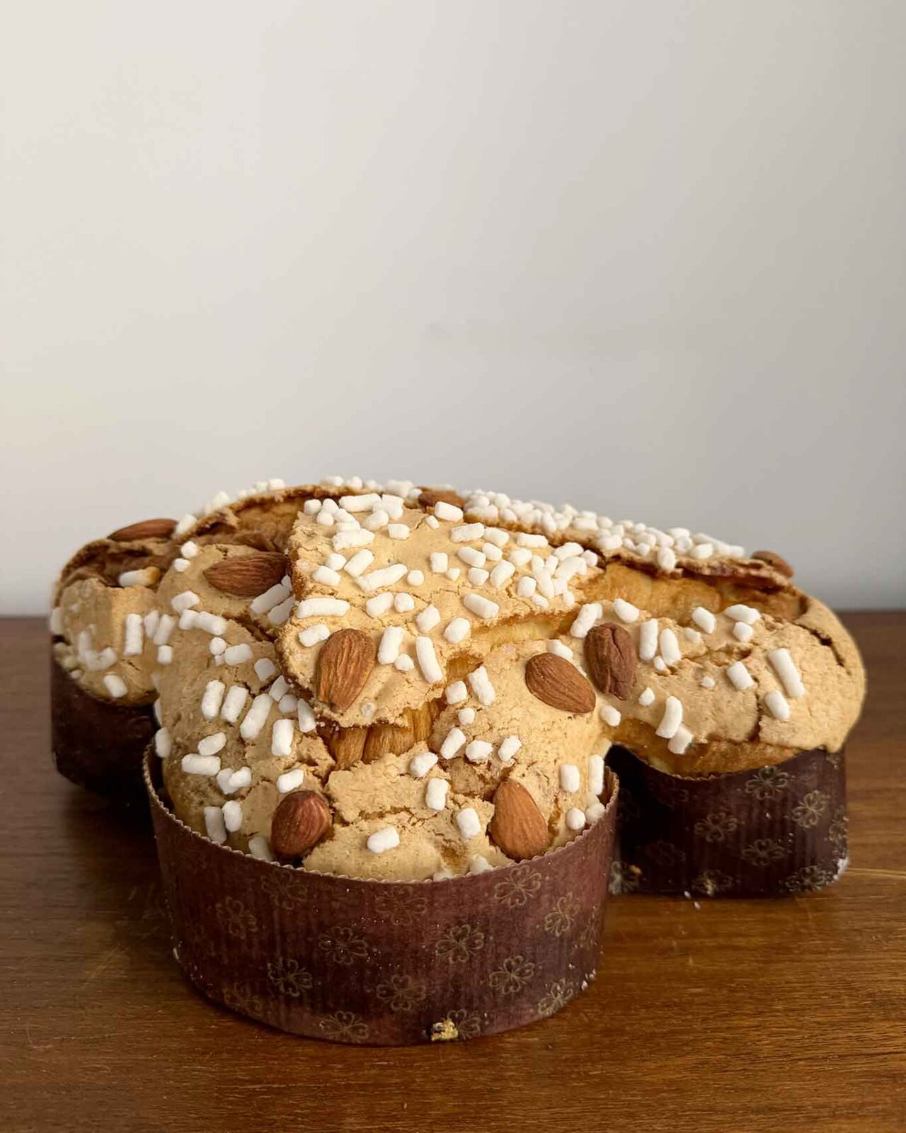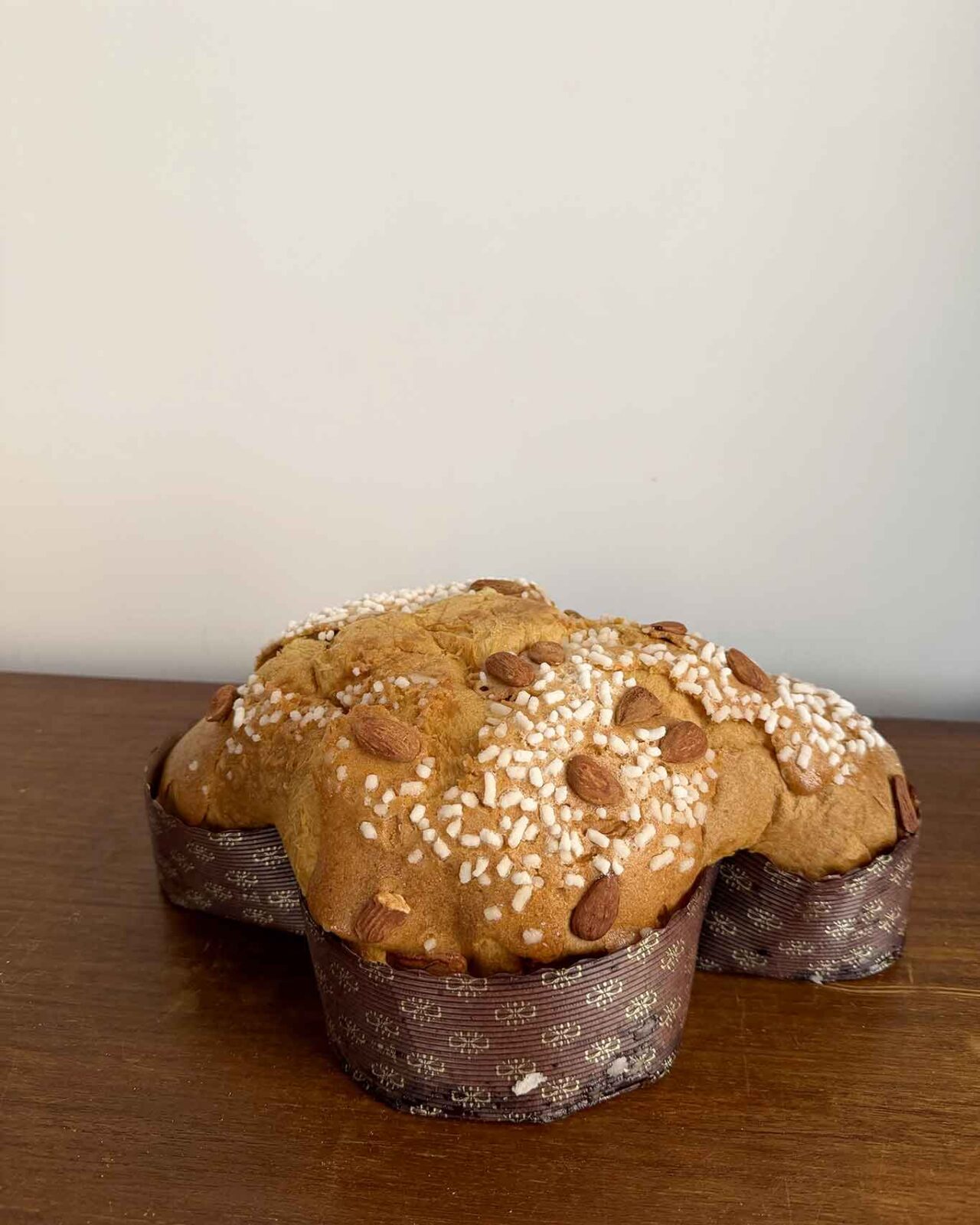 Colomba che si presenta valida e ordinata. La crosta è salda, la glassa ben riuscita, puntellata con equilibrio da mandorle distribuite con criterio. Al taglio emerge una struttura ariosa e lodevole, segno di una lavorazione attenta. Tuttavia, l’umidità risulta contenuta e il morso offre una certa resistenza. È un impasto corretto, lineare, che privilegia la pulizia esecutiva rispetto a una maggiore rotondità tattile. Il profilo aromatico è misurato e ben calibrato. L’arancia candita si esprime con eleganza, la vaniglia accompagna senza invadere, lo zucchero è dosato con gioia. Il bilanciamento complessivo è armonico, poco dolce, coerente con l’impostazione tecnica.