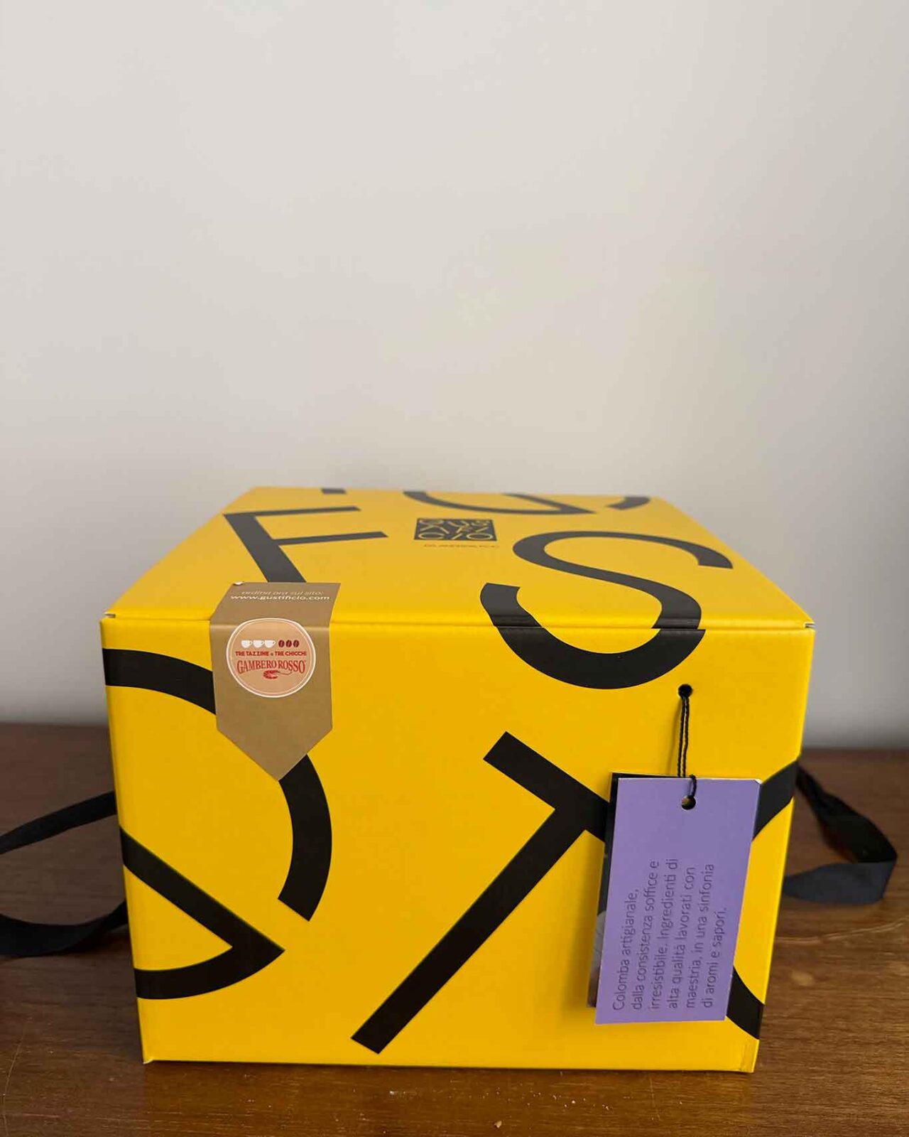 La sofficità è estrema, con un impasto molto umido, filante e armonico, puntellato dalla vaniglia. Al morso la struttura è ben integrata anche se leggermente appena indietro di cottura — una sfumatura minima che non compromette l’insieme. Consistenza goduriosa, una sorpresa piacevole per equilibrio e scioglievolezza. I canditi risultano ben distribuiti, anche se leggermente più morbidi del previsto. Nel complesso è una colomba con stile, ben costruita, con equilibrio tra dolcezza, profumo e struttura. Bianco su giallo persistente i toni dello scatolo rettangolare.