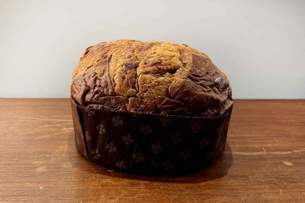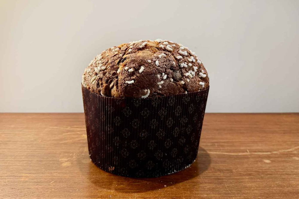 Merito di un panettone con l’impasto al cioccolato che è già profondo di suo. È una tesi di dottorato su come deve essere un panettone al cioccolato. Mai secco. Cupola perfetta, lievitazione da capogiro, umidità controllata e presente, cioccolato di qualità inaudita equamente distribuito su tutta la maglia. Panettone da lode.