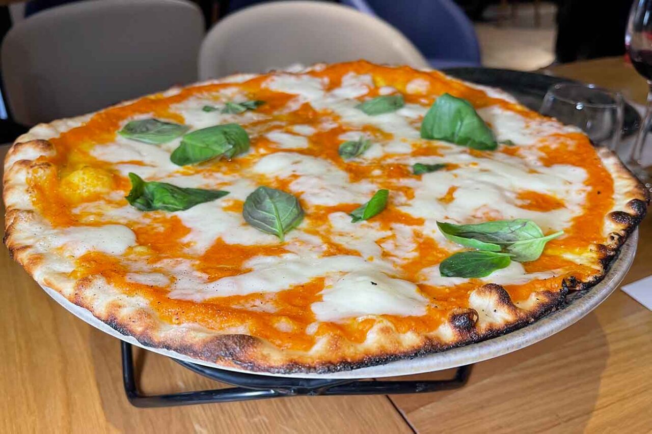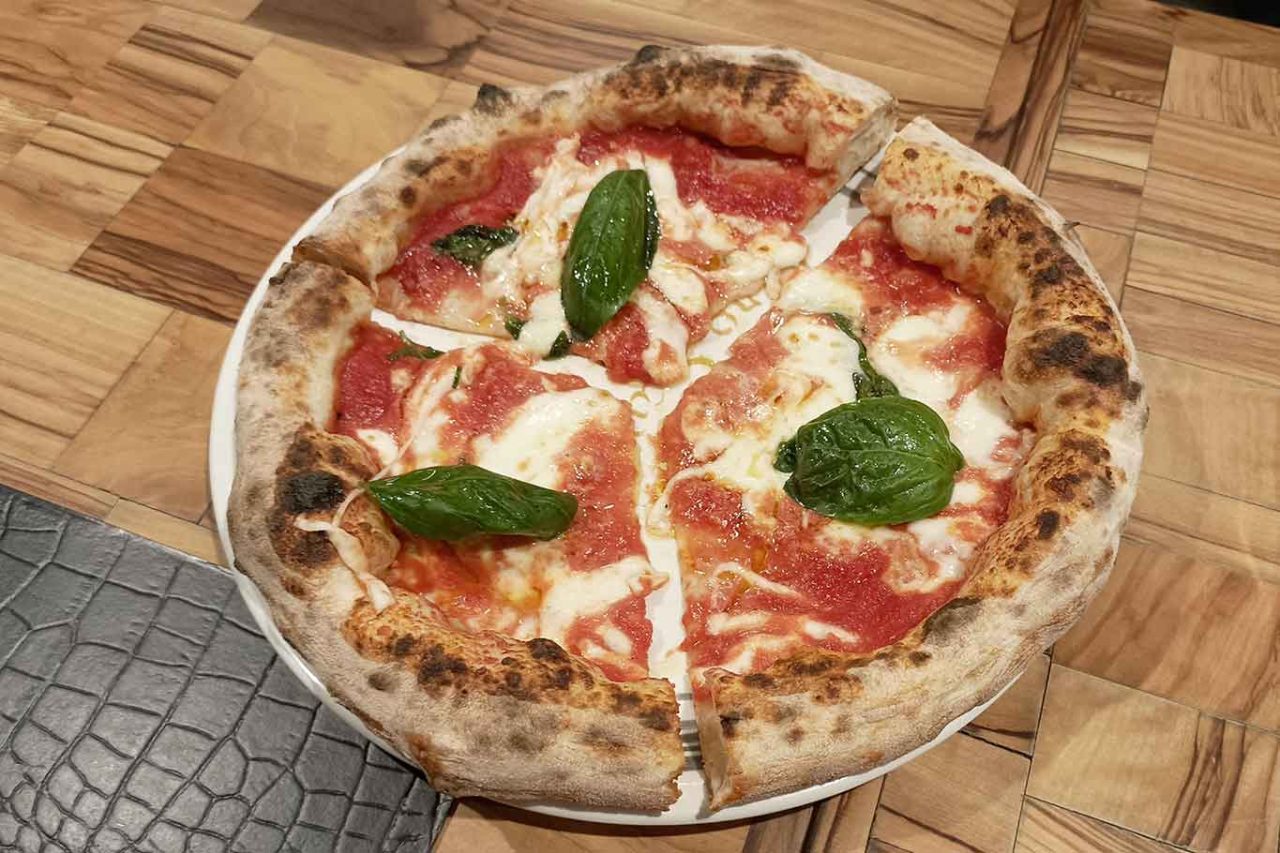 Davide Ruotolo è alla ricerca continua dell’equilibrio anche con un panetto molto leggero (sui 230 grammi) che comunque gli consente di dare forma e volume a un cornicione importante. Ottimo il fiordilatte come il pomodoro e l’olio extra vergine di oliva. E qui si fa attenzione anche al basilico fresco. Se cercate la pizza Margherita contemporanea, Palazzo Petrucci Pizzeria nel cuore di Napoli è il posto che fa per voi. La migliore pizza Margherita della Campania, come se non bastasse, la cuoce in un forno elettrico. Quasi da gridare al sacrilegio, considerata la chiesa attigua e la collocazione al centro dei Decumani della pizza napoletana.