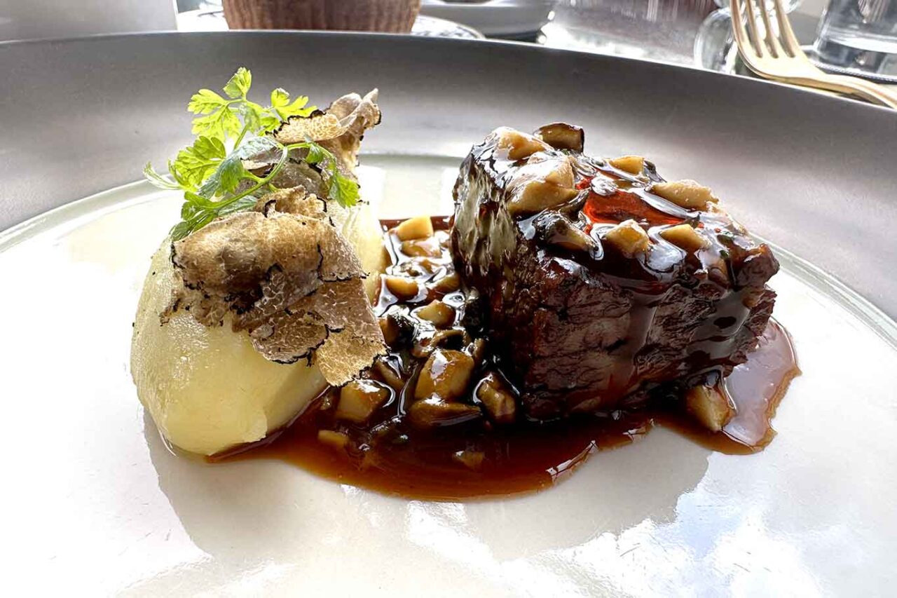 Le Costine di manzo arrosto sono accompagnate dal purè di patata al tartufo mentre il fondo di manzo con funghi vuole ricordare il Sunday roast londinese. Il fondo eccede un po’ di sapidità, ma la carne è saporita e si scioglie piacevolmente in bocca. Il piatto è accompagnato da un parfait ai funghi.