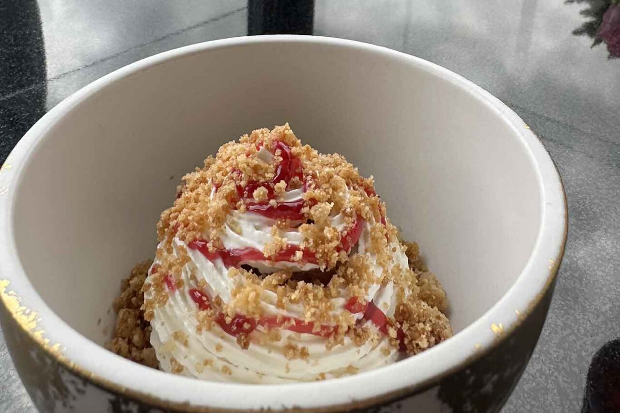 Con la Crostatina di ricotta e visciole, gel di amarena, mousse di ricotta Il finale è una dedica a Roma. Il pre dessert omaggia la tipica crostata in una versione più leggera e con un elegante impatto estetico. Una mousse di ricotta con gel di amarena nasconde una granita di amarena e lime. A ricordare la consistenza e la burrosità della crostata, un crumble di mandorla.