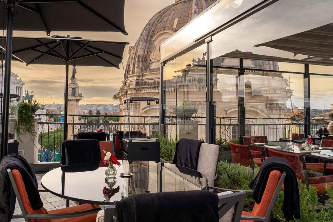 Oro Bistrot entra a pieno titolo tra le terrazze di Roma da segnalare perché ha una vista spettacolare sui Fori Imperikali dal sesto piano dell’NH Collection. L’hotel è un cinque stelle aperto nel 2019 in un antico palazzo patrizio del rione Trevi con la terrazza che si apre alla vista sull’Altare della Patria e la cupola di San Pietro.