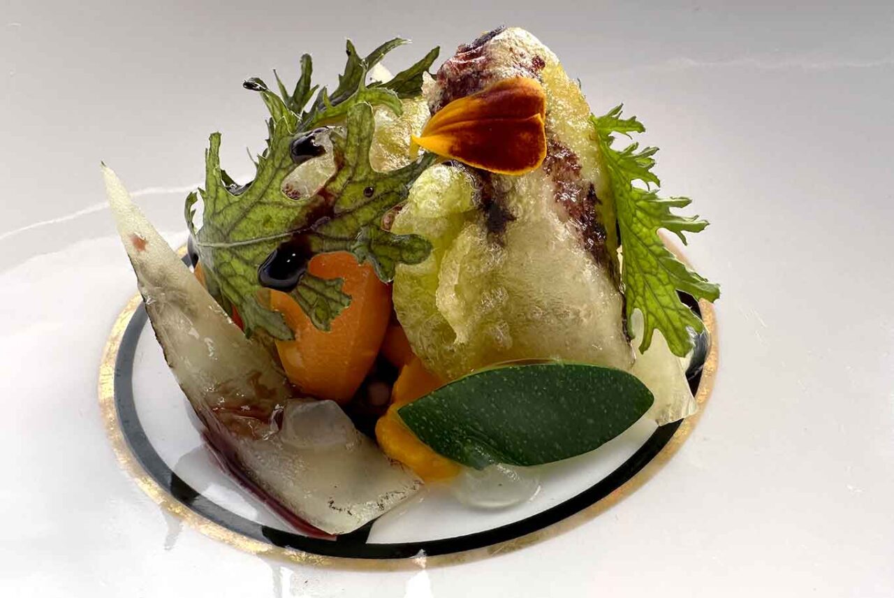 Nella Triglia in carpione alla base c’è un misto di di verdure in carpione con zucchina, cipolla e carota che poi ritroviamo in crema con il gel di carpione. La triglia fritta in tempura e condita con poca senape dolce è morbida e ha un gusto deciso ma delicato. La sua dolcezza è ben bilanciata con l’agro del condimento.