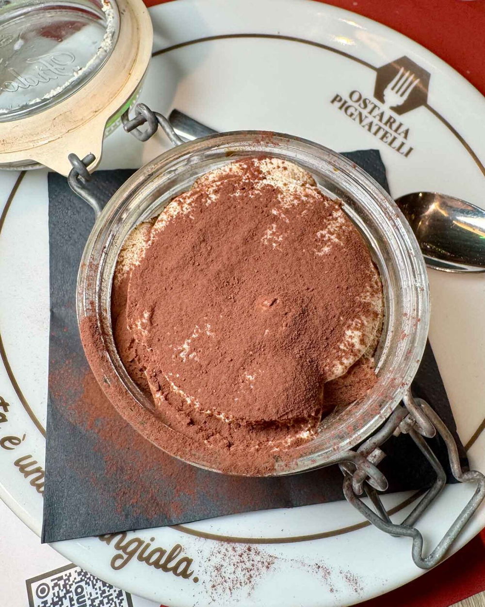 Che ci fa decidere per un dolce di chiusura. Tra i fatti in casa dell’Ostaria Pignatelli e i dolci di Sal De Riso, scegliamo un tiramisù in barattolo di vetro un po’ leggero di caffè e una fetta di cassata natalizia ben fatta (6,50 euro).