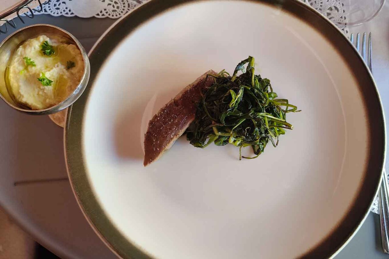 Poi si torna al mare in purezza. Per il piatto Pescato, hummus e cicoria (24 euro) è proposto il tonno alletterato o tonnetto che si distingue per i segni neri sul dorso che sembrano delle lettere o simboli. È preparato al barbecue, lasciando la parte più interna rosa, accostato con la cicoria e con l’hummus in una coppetta a parte.