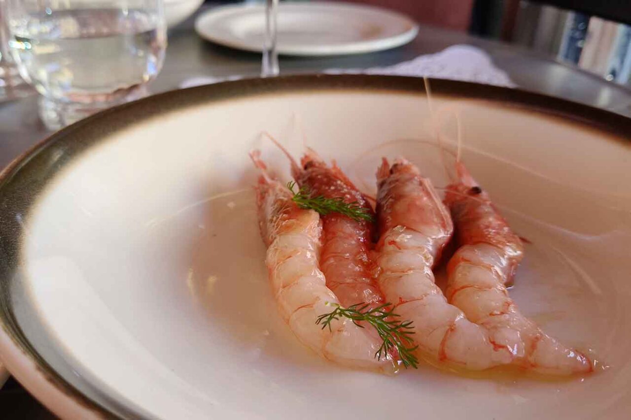 Come fuori menù mangiamo un crudo di gamberi rosa e viola.