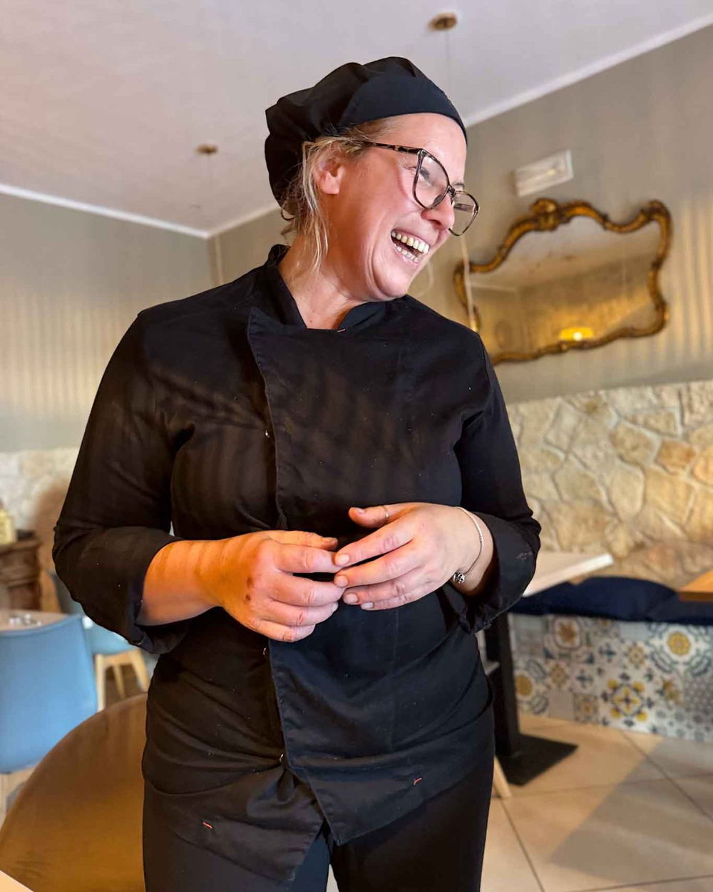 Non è cuoca, anche se sa stare in cucina accanto allo chef e al suo aiuto. E ci sta soprattutto di domenica quando lo chef non c’è e il menu del pranzo della domenica diventa – come dice – più casereccio.