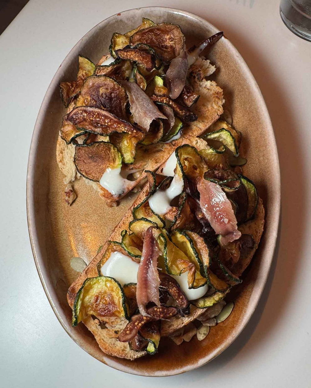 In attesa della comanda, arriva al tavolo il benvenuto con una fetta di pane, zucchine, fichi e acciughe.