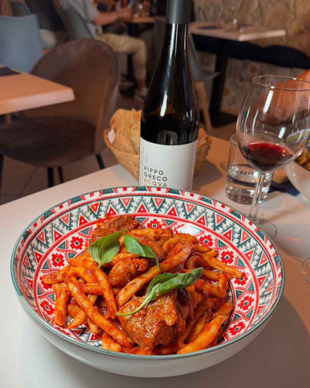 La domenica vuol dire ragù e quindi non ci si può esimere da un assaggio di fusilli al ferretto conditi con il sugo tradizionale (15 euro). Assaggio per modo di dire perché i piatti dell’osteria Materia sono molto generose. Un pelo sotto le lagane indubbiamente meglio riuscite anche per cottura.