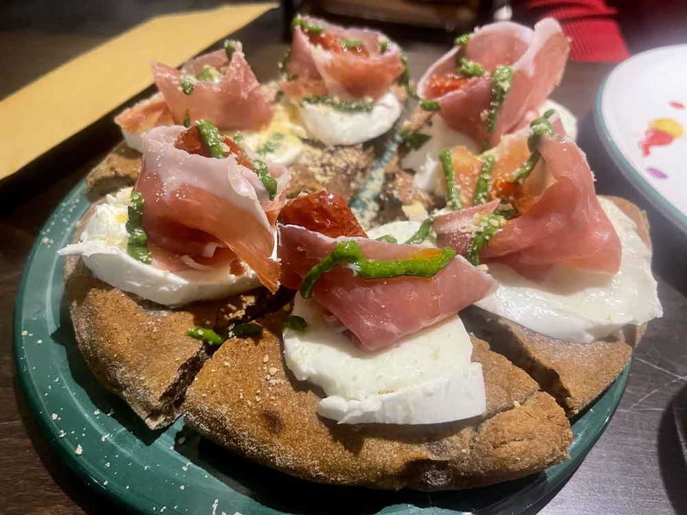 A seguire, La mia isola verde, padellino di farina di segale e orzo. Molto buono con topping di prosciutto crudo, mozzarella di bufala, crumble di parmigiano, crema di rucola e olio evo.