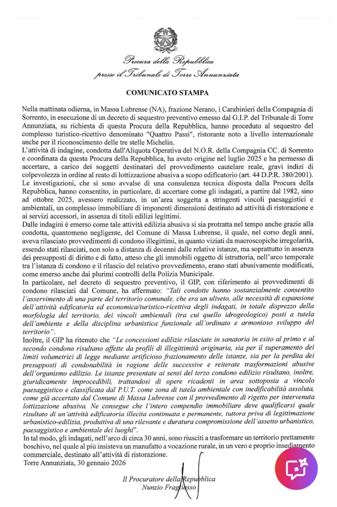 Il Quattro Passi di Nerano non è solo un ristorante: è un simbolo della gastronomia mondiale, l’unico tre stelle Michelin a sud di Roma (conquistate nel 2023) e un punto di riferimento per il jet set internazionale. L’inizio del 2026 ha portato una tempesta giudiziaria che ha scosso le fondamenta di questa “maison” del gusto. Il provvedimento di sequestro preventivo del Quattro Passi firmato dal gip del Tribunale di Torre Annunziata.