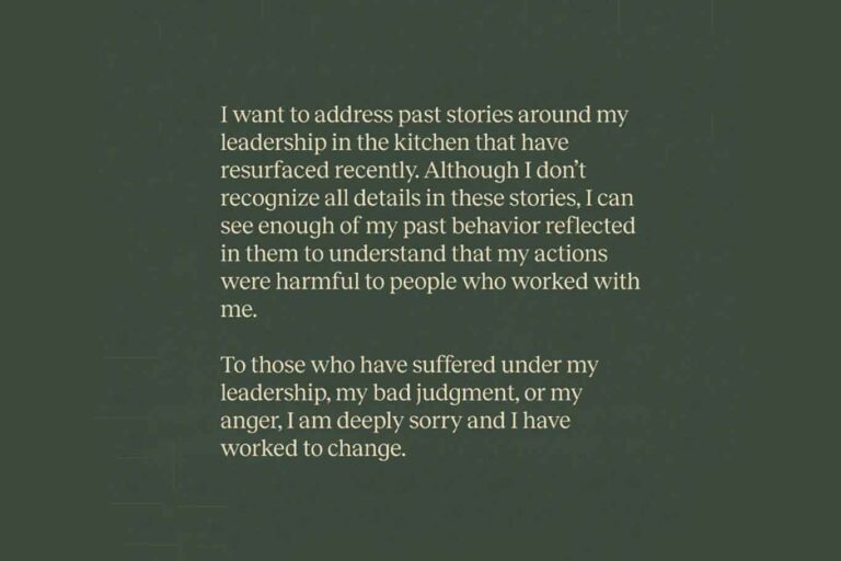 Vorrei affrontare alcune vicende passate relative alla mia leadership in cucina che sono riemerse di recente. Sebbene non riconosca tutti i dettagli di queste vicende, vedo in esse un riflesso sufficiente del mio comportamento passato da capire che le mie azioni sono state dannose per le persone che hanno lavorato con me.