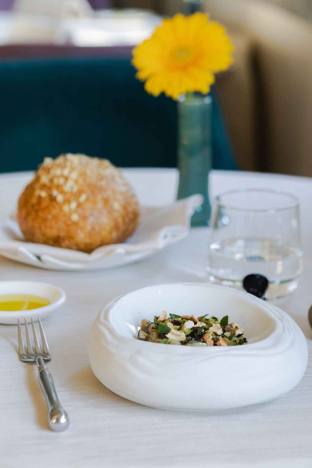 A completare la composizione, la croccantezza dorata del pane al prezzemolo e la nota tostata della granola di anacardi e arachidi.