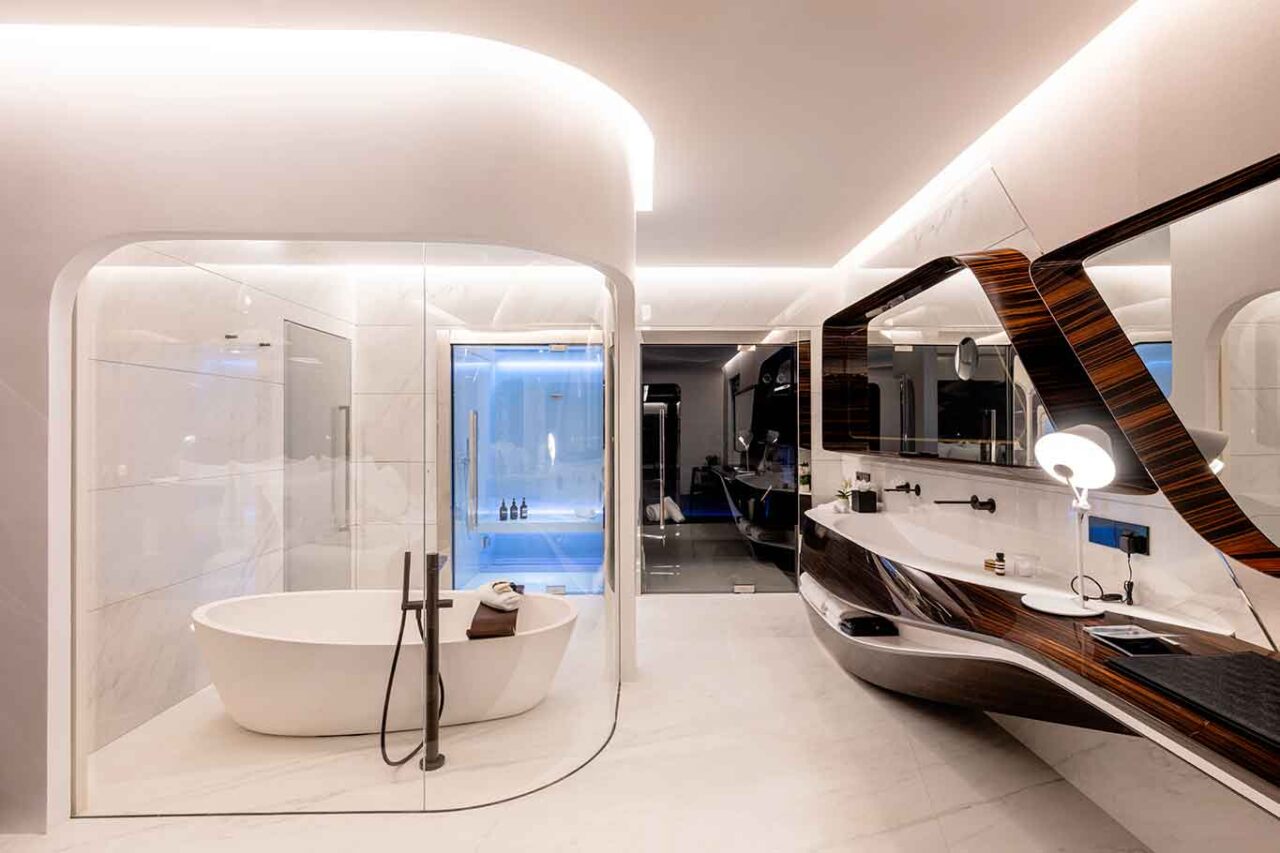 Ideato e realizzato dallo studio Zaha Hadid, l’hotel Romeo lo fa rispettando la storia secolare del palazzo con un approccio architettonico d’avanguardia e sostenibile. Il progetto ha privilegiato l’uso di materiali pregiati come ebano Macassar, marmo Nero Marquina, marmo di Carrara. Le 74 camere e suite, alcune con affreschi originali, hanno linee curve e forme morbide che ricordano gli ambienti degli yacht.