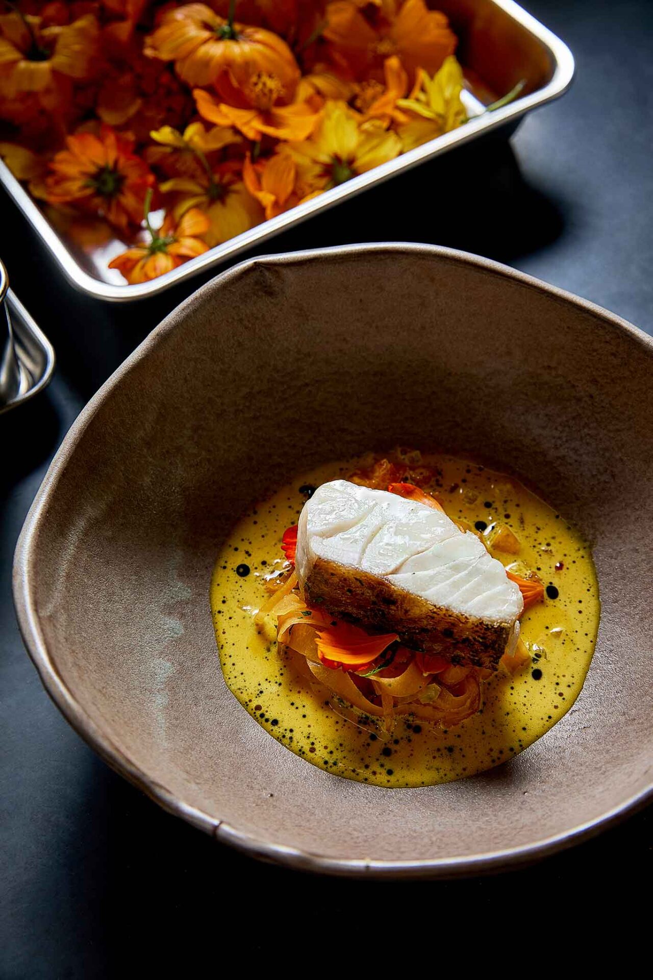 Cernia, zucca e ricci di mare. La cernia del Mediterraneo è cotta al barbecue preservando succosità e morbidezza. Accompagnata da una salsa a base di zucca Napoli e ricci di mare della costa, è completata dagli agrumi di Sorrento che apportano freschezza e profumo. Adagiate sulla cernia, chips di zucca scottata. Un piatto che fa pensare alla Francia per la presenza importante della sua salsa con i ricci che bilanciano in sapidità e dolcezza naturale la ricetta.