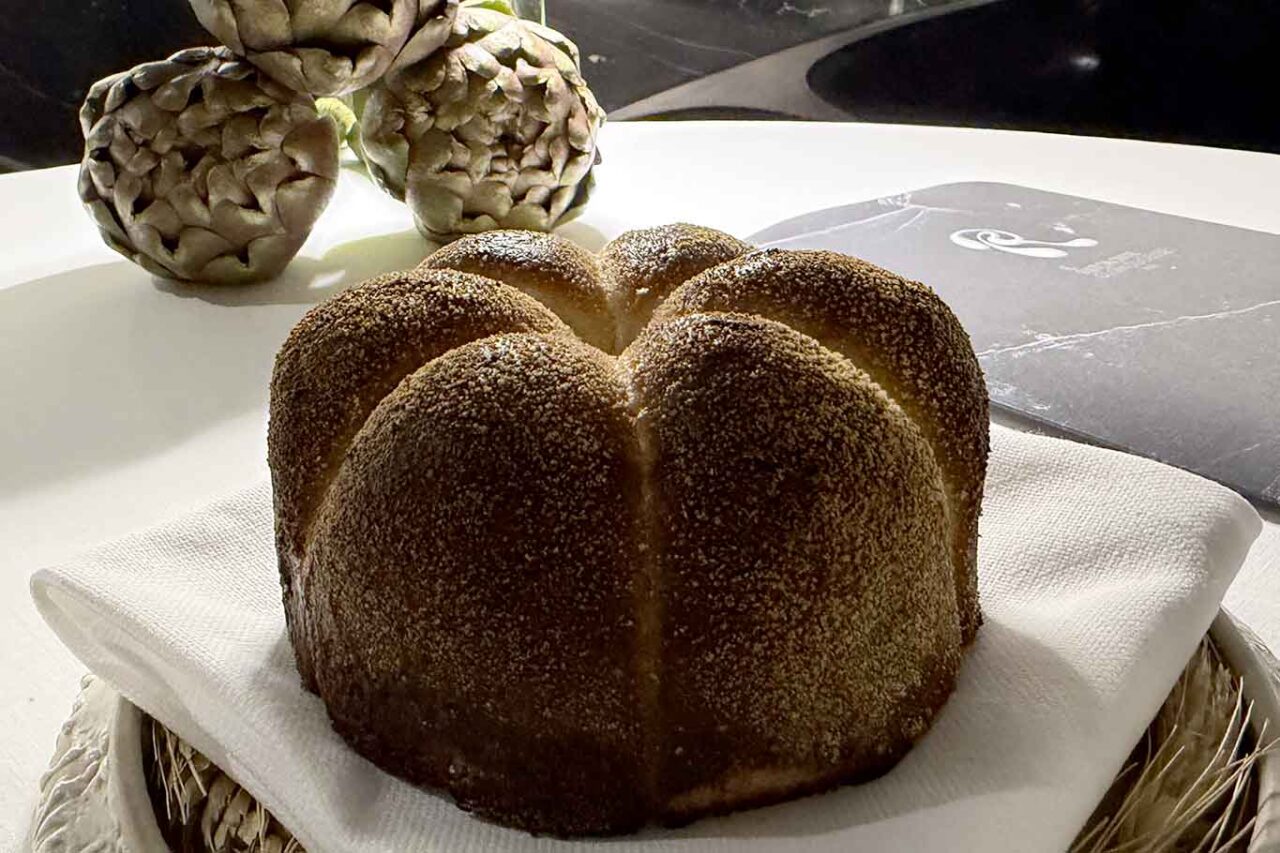 In tavola sono serviti due tipi di pane, una pagnotta con una cottura iniziata in forno e finita in brace, che ha cosi rilasciato un gradevole profumo di carbone. Una fetta di pane di campagna a lievito madre con un mix di semi a dare croccantezza.