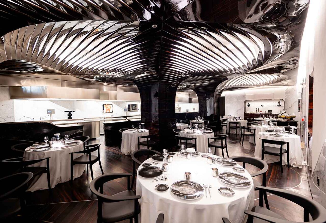 Invece, nel Ristorante Alain Ducasse Roma una elegante sala ripercorre lo stile dell’hotel. Il colpo d’occhio ricade sulla cucina a vista, divisa solo da un bancone, che diventa il palcoscenico di un fine dining in diretta. Cosi come non passa inosservata la mise en place con posateria Jean Elyseè Puiforcat, l’argentiere francese più importante del periodo Art Dèco.