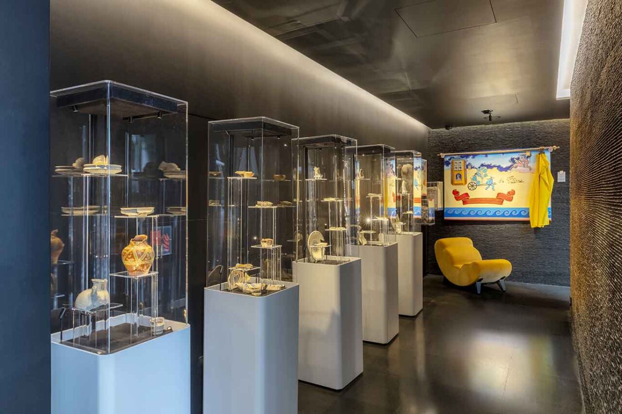 Il Romeo di Roma non è solo un hotel, ma una galleria d’arte che espone opere di artisti contemporanei, come Christian Leperino e Mario Schifano, e reperti archeologici romani tra cui la testa di Drusilla.