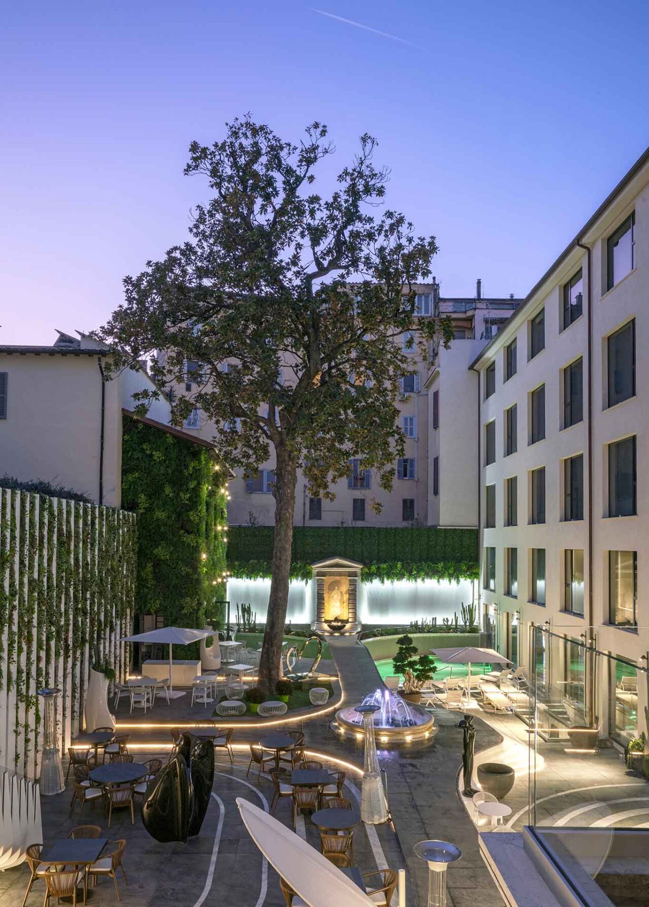 L’offerta gastronomica si sviluppa in più spazi. Il cortile interno di circa 1.000 metri quadri è un giardino che ricorda resort tropicali con la piscina contornata da isole food and drink. Il ristorante il Cortile offre un servizio di all-day dining all’interno e all’esterno, il bar è sempre aperto e non manca la griglia.