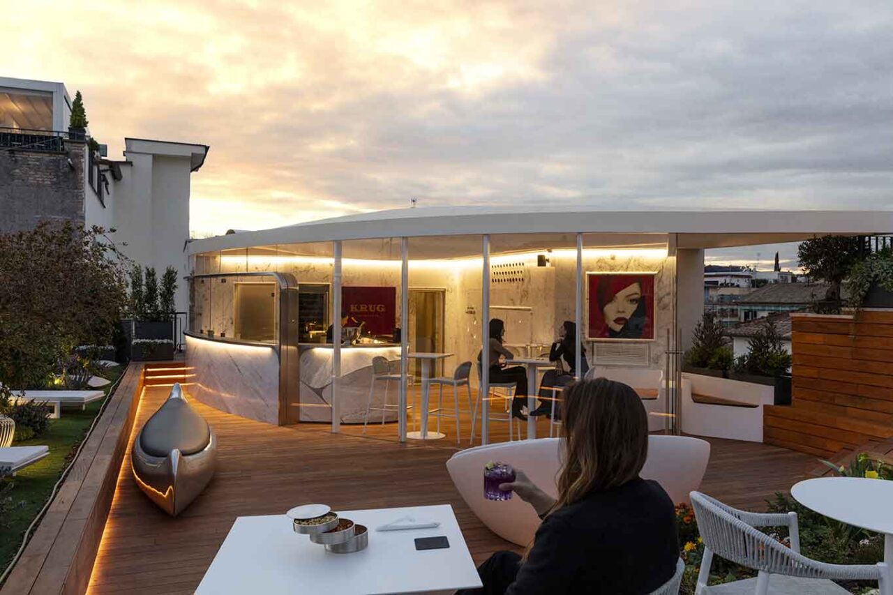 Il rooftop ospita invece la terrazza in collaborazione con Champagne Krug e qui i clienti dell’Hotel Romeo Roma possono consumare l’aperitivo con vista sui tetti della capitale.