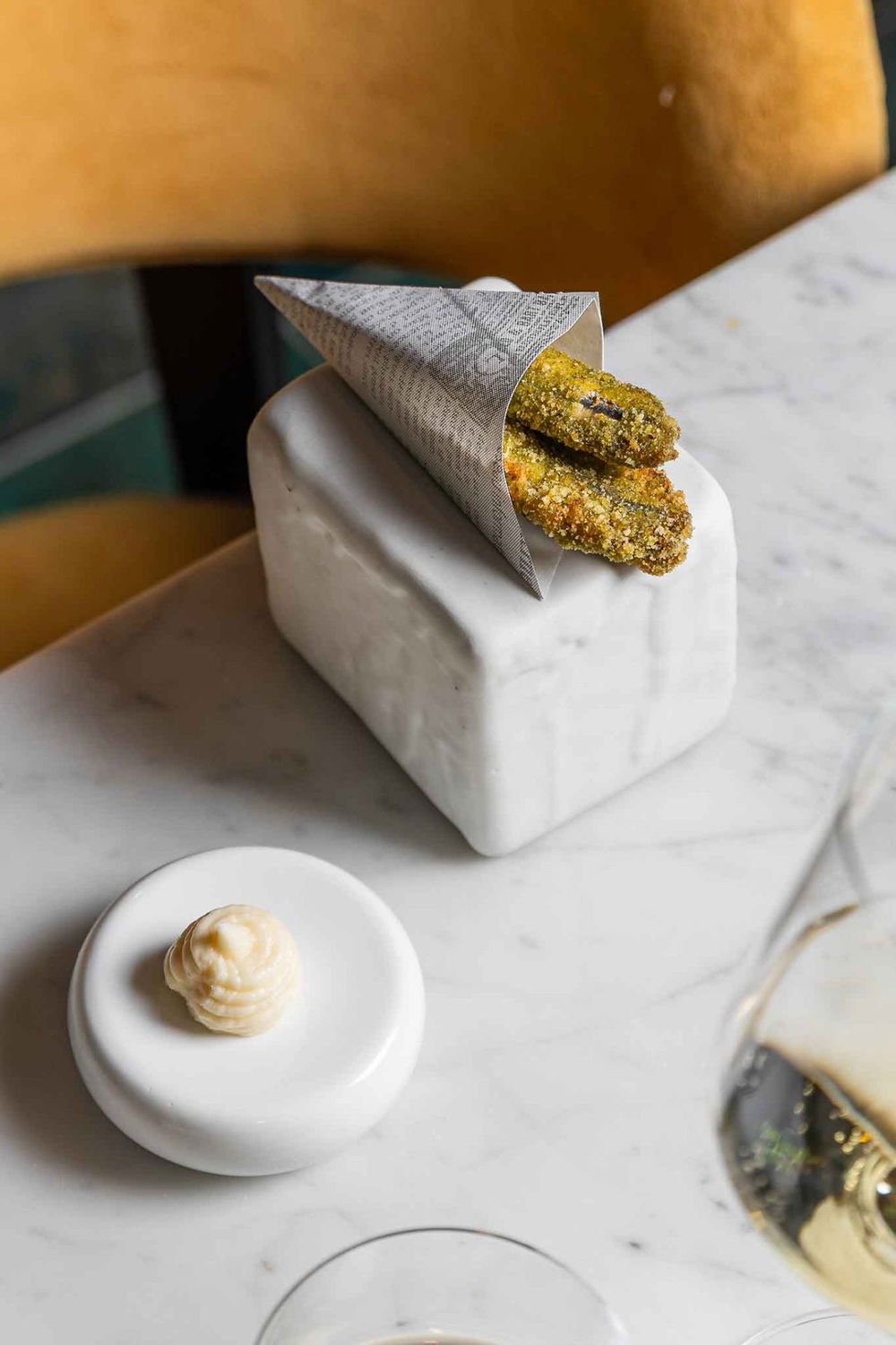 Alla cena stampa, in attesa di dare il primo “mozzico”, arriva un gustoso cannolo di pasta fillo con ricotta, bottarga e crumble di olive, molto delicato. A seguire, la macedonia di frutta e verdura con le sue note acidule e lievemente speziate che ricordano il tabouleh. Riporta all’altra cucina dello chef, quella mediorientale del Masa Rooftop, sulla terrazza dell’Hotel Major a Santa Maria Maggiore (stessa proprietà).