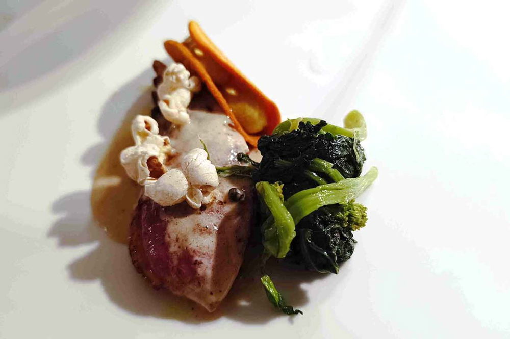 L’interpretazione del Filetto al pepe verde di Danilo Mancini (28 €) prevede l’anatra: rosolata e cotta a puntino, e servita con cime di rapa saltate e un croccantissimo taco di mais. Forse è il piatto che ricorda meno quello da cui trae ispirazione, ma è ben fatto e ben abbinato, nelle cotture, nelle sue parti amare e grasse, nel gioco tra morbido e croccante.