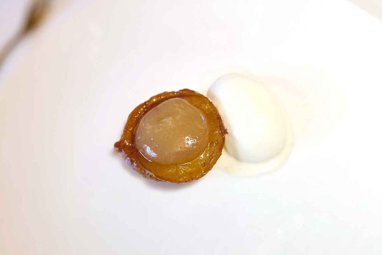 Ho optato per il menu à la carte. E ci è stato servito il benvenuto. Il cucchiaio balsamico (daikon marinato nell’aceto di champagne, maionese piccante); pescato, patate e salvia; cocktail di mazzancolla e cialda di sesamo.