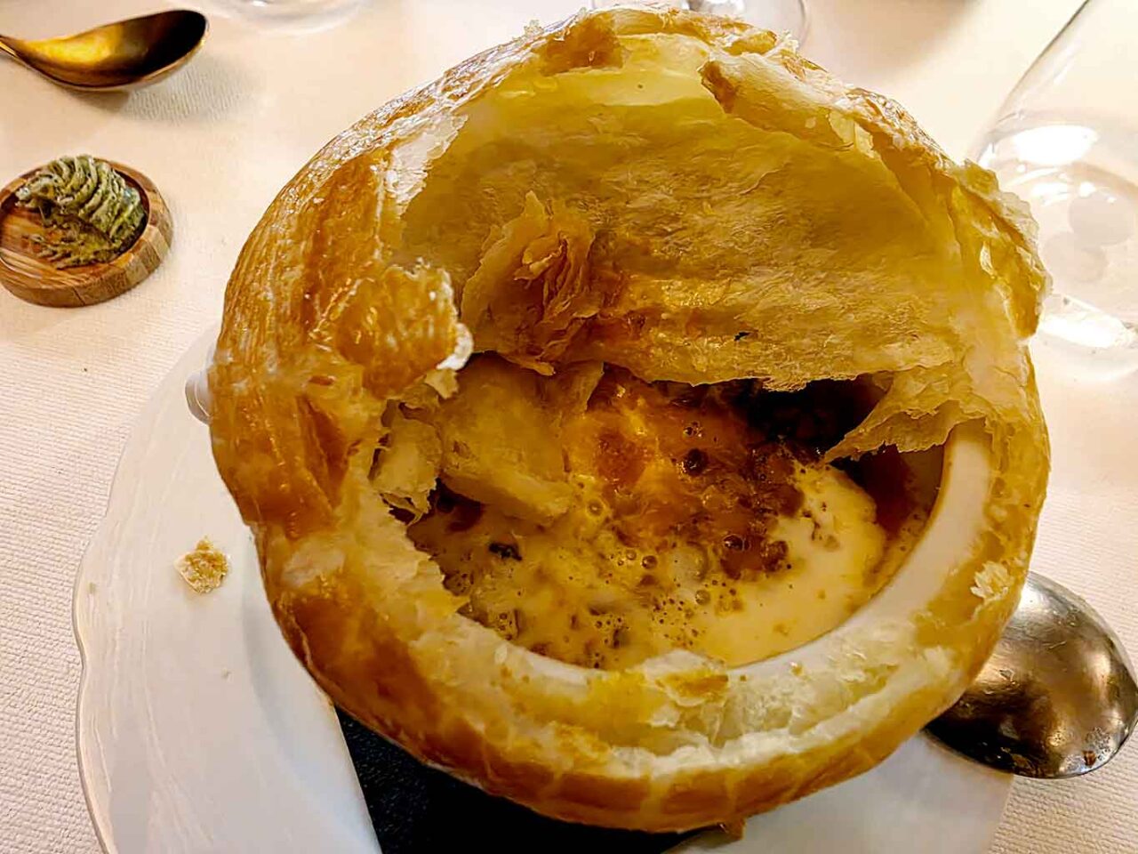 Zuppa in crosta, funghi, zucca e cipolla fondente e salsa di stagionato di Vaise (18 euro).