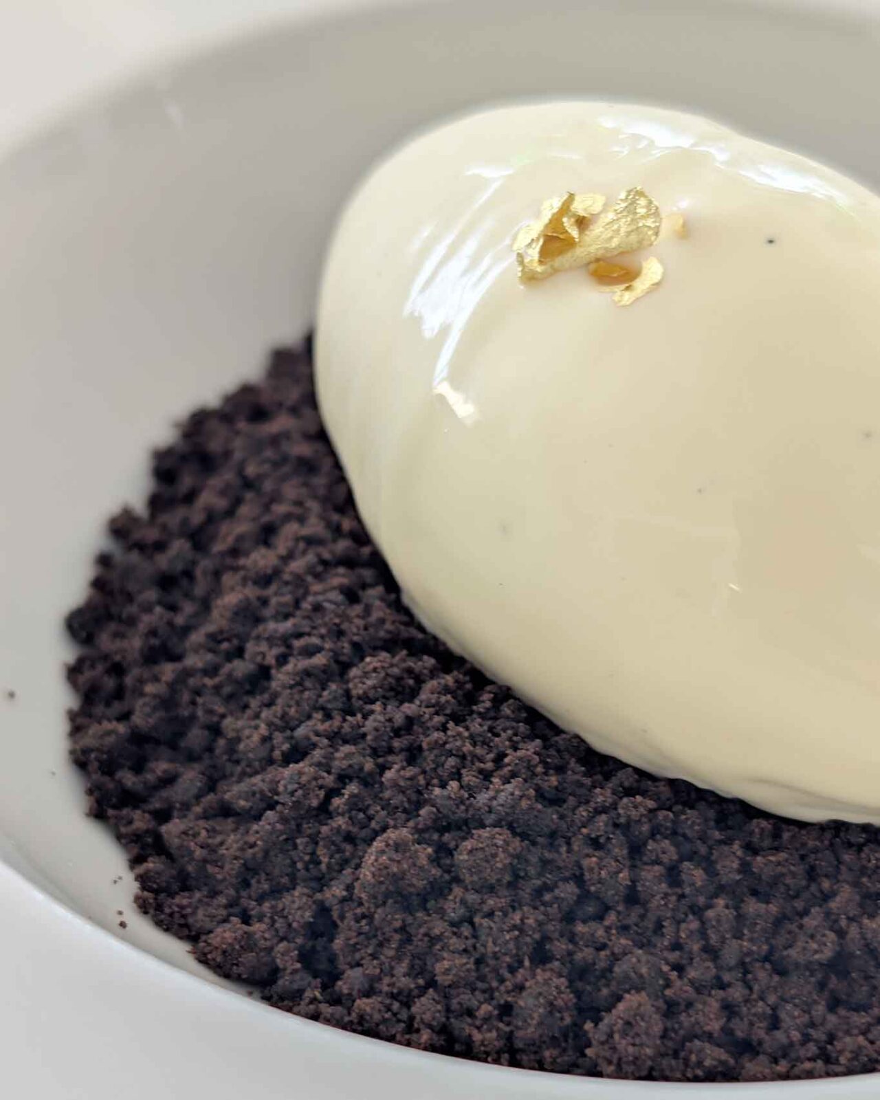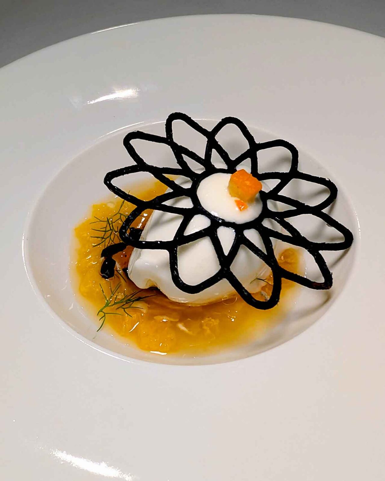 La transizione verso il mondo dei dolci è stata affidata all’insalatina di arancia, finocchi e olive nere. Una quenelle candida di sorbetto al finocchio, morbidamente adagiata su un lucido e vibrante brodetto di arancia, il tutto impreziosito da una sapida guarnizione di olive nere. La preparazione sfrutta al massimo le note acide, balsamiche e amaro-salmastre degli ingredienti per azzerare ogni residuo di grassezza accumulato sul palato. Il sipario è calato con la nuvola.
