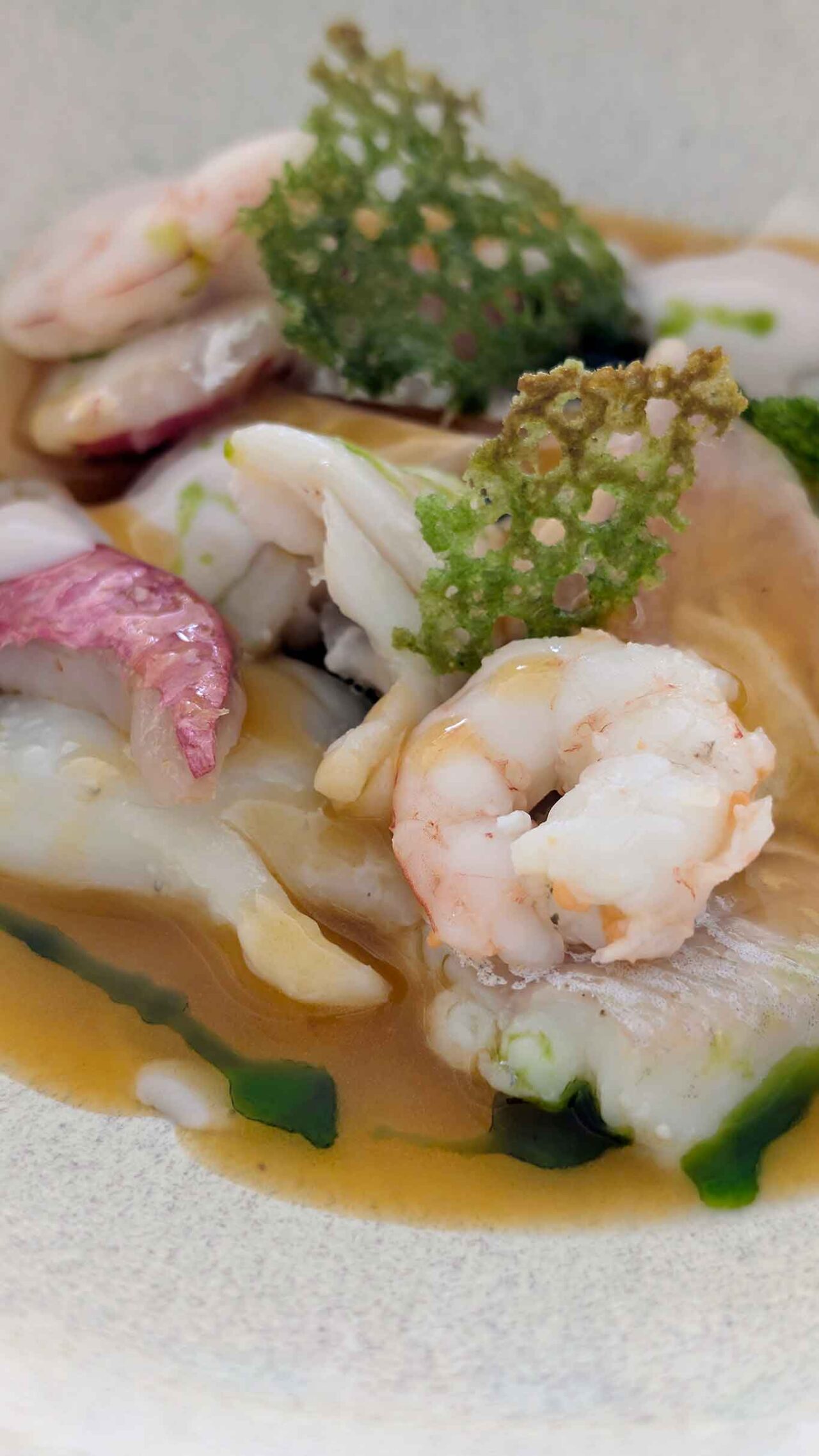 L’apertura è stata affidata a un grande classico divenuto iconico per la struttura: l’insalata di mare. La sua presentazione in sala acquisisce i connotati di un rituale ipnotico. Il pescato freschissimo del giorno, tagliato con precisione chirurgica, viene adagiato nell’apposito cestello e cotto al vapore direttamente al tavolo sotto gli occhi del cliente. La tecnica restituisce un capolavoro di essenzialità marinara. La carnosità dei molluschi, il rosa acceso dei crostacei e la texture tenace del pesce esplodono in bocca in maniera incontaminata, nuda e purissima.