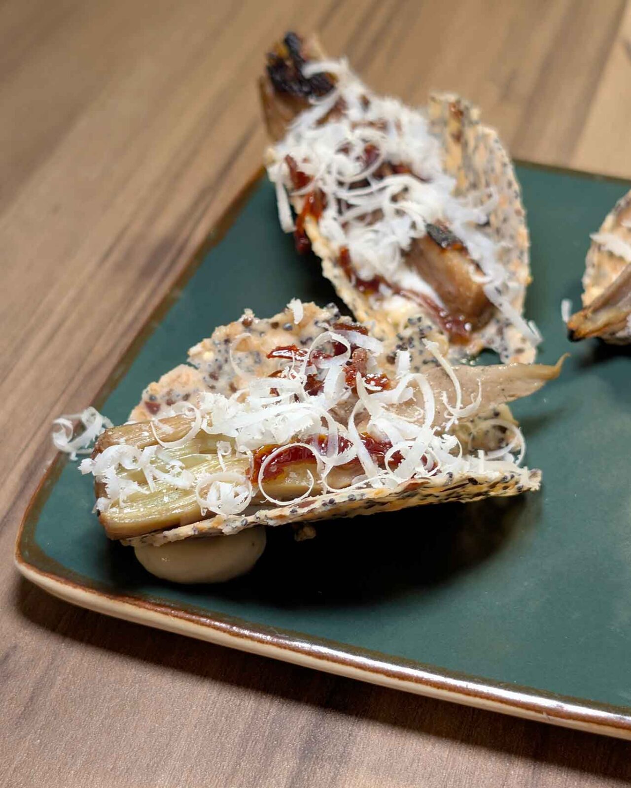 Un tacos croccante farcito con carciofi cotti alla brace chiude il prologo con la decisa sapidità di una ricotta salata di rara intensità.