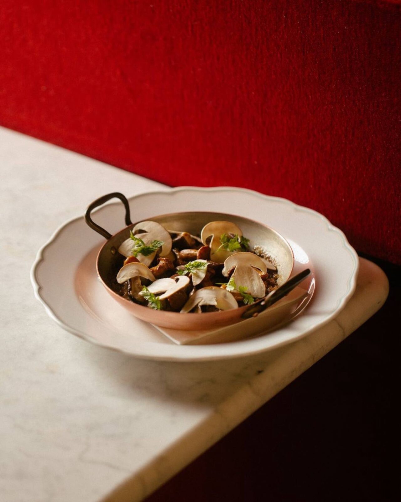 La degustazione prosegue con la Minestra di riso (55 €) ovvero risotto ai funghi di stagione con lamelle di funghi freschi a crudo, tartufo nero e un’emulsione di champignon. Piacevole la presentazione in piccoli tegami. Piatto molto profumato e dal perfetto equilibrio al gusto con una bella nota sapida e avvolgente.