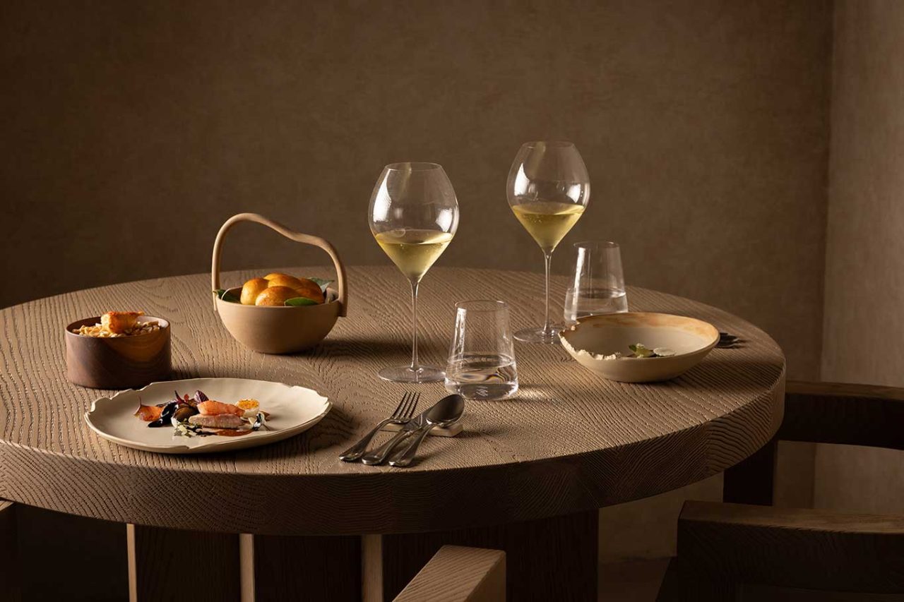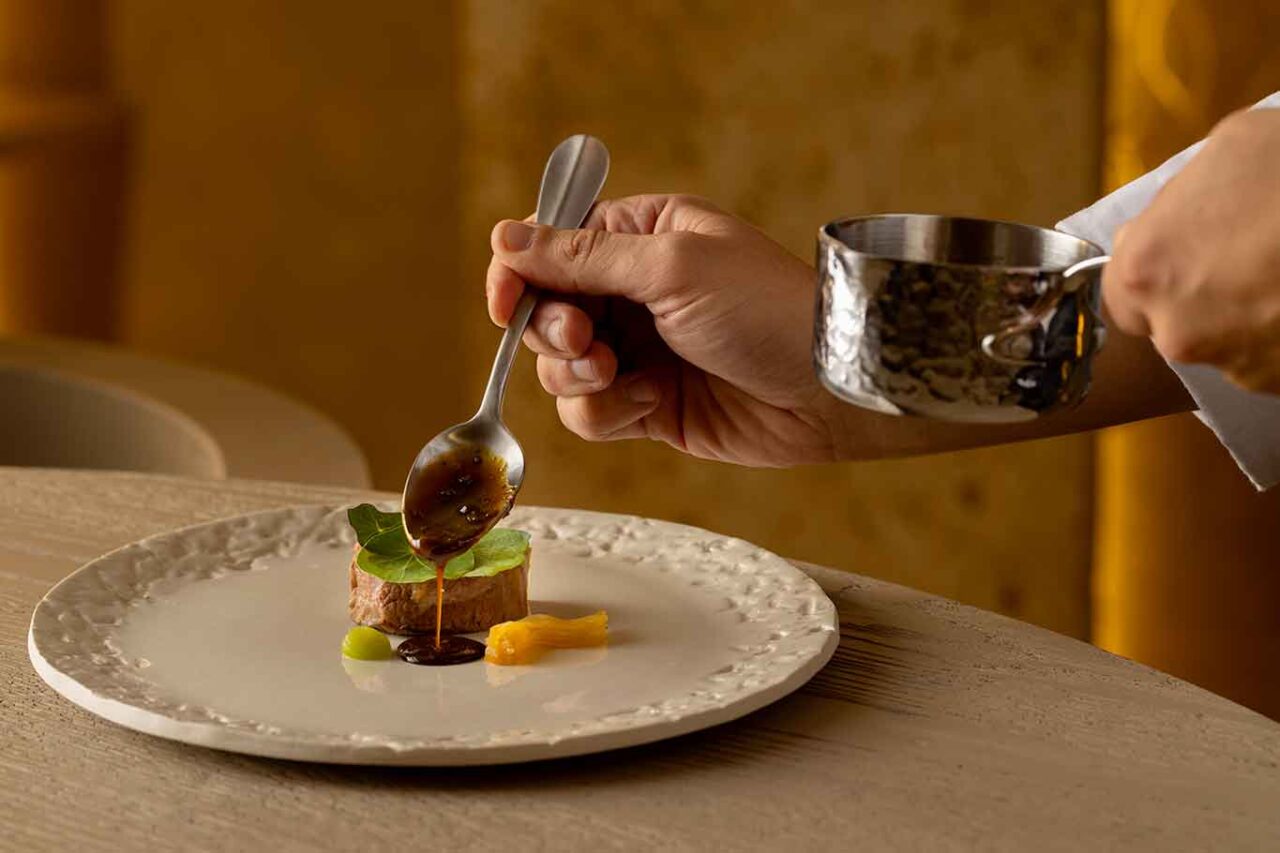 Il teatro della sala del Nomos Ante si riempie di contenuto, tra travertini, marmi e un beige diffuso che mette in risalto portate e commensali. E il regista di sala, Antonio Cannoniero, Restaurant Manager e Wine director, porge e sottolinea pietanze con gesto esperto ma mai freddo. Anzi, vicino e caldo, quasi amicale.
