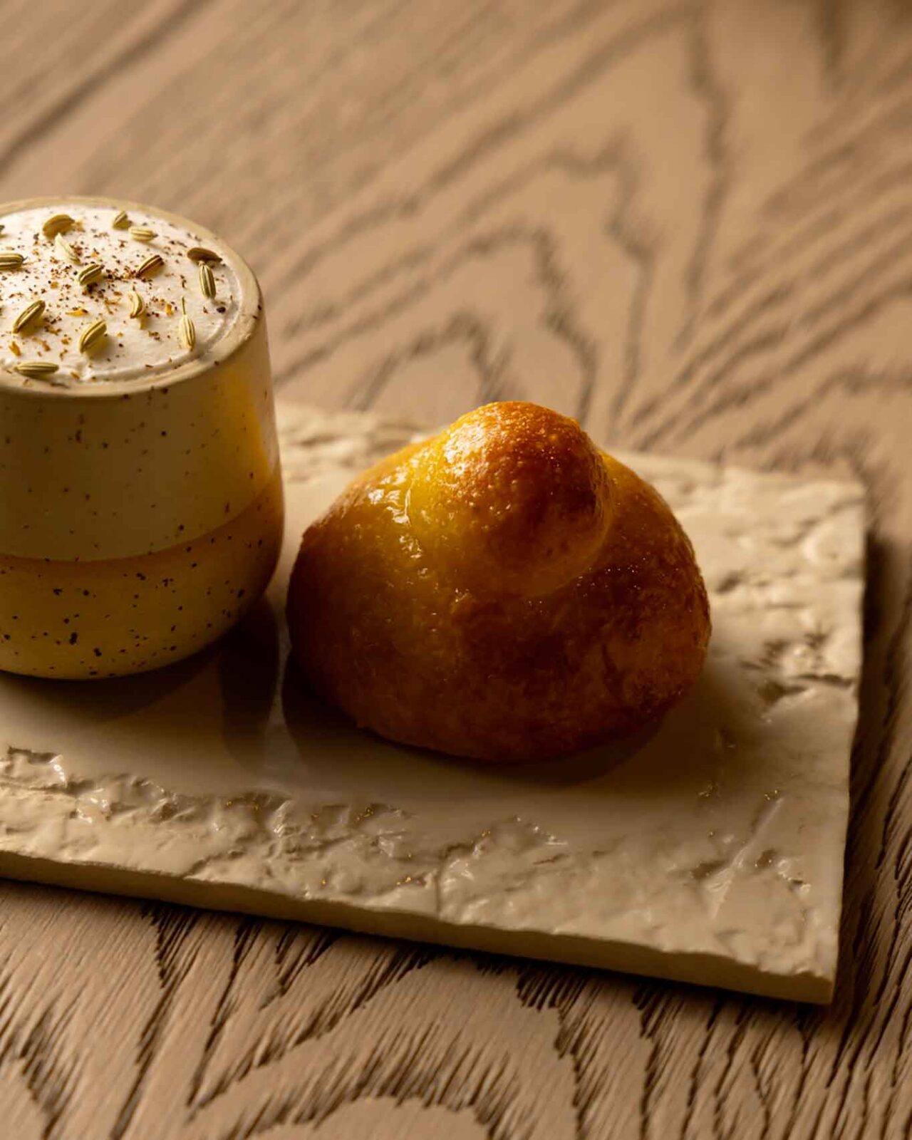 Brioche siciliana con granita ai gelsi, panna al finocchietto e pepe Timut.
