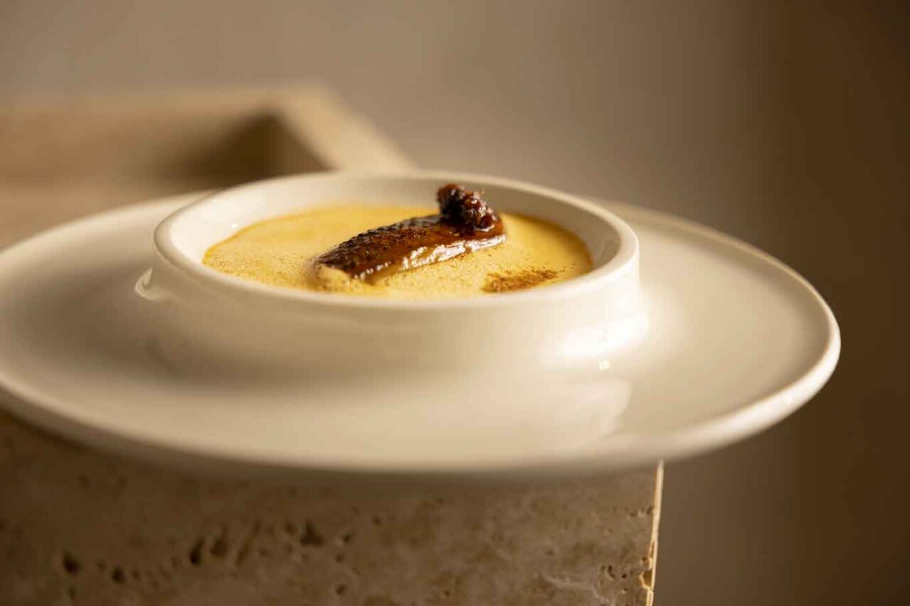 La nostra cena stampa si apre con l’amuse-bouche è un chawanmushi – letteralmente “vapore di tazza da tè” o “cotto al vapore in una tazza da tè”. Cioè un piatto salato della cucina giapponese a base di crema pasticcera. È una sorta di budino dalla texture setosa, preparato con latte e uova, servito solitamente a colazione. La versione dello chef ha alla base un flan di uova di quaglia cotto in barbabietola, tartare di quaglia rossa ed è completata con kefir affumicato con aringa.