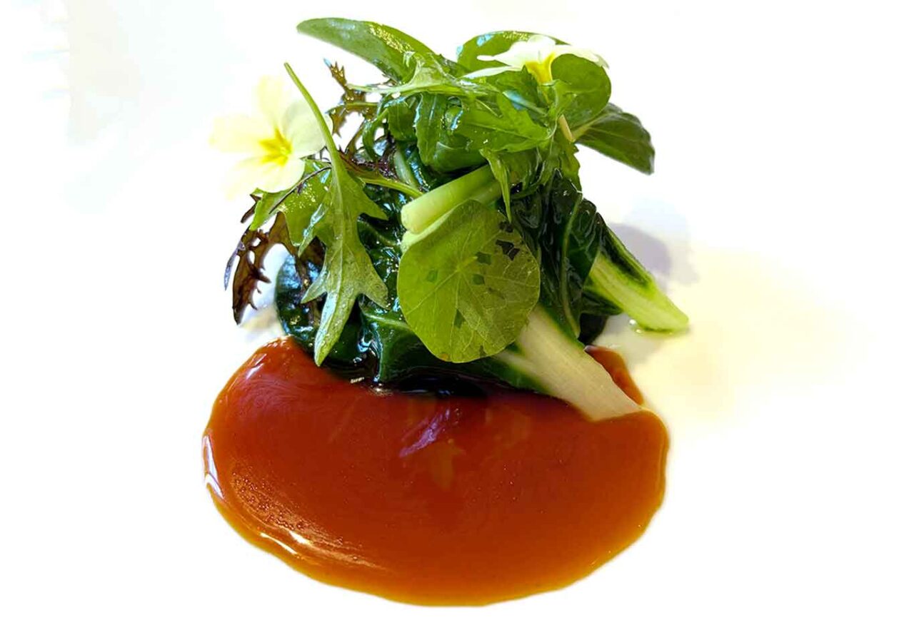 Il filetto di maiale Mangaliza è con bietola, purea di bietola e bietole baresi. Si chiude con un cappelletto di ‘nduja in brodo di maiale.