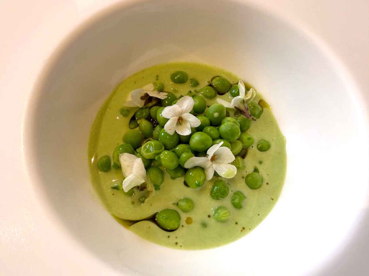 Poi tocca ai Piselli freschissimi, verdissimi: nuovi piselli in salsa di piselli, aromatizzati con olio all’aglietto e grasso di maiale.