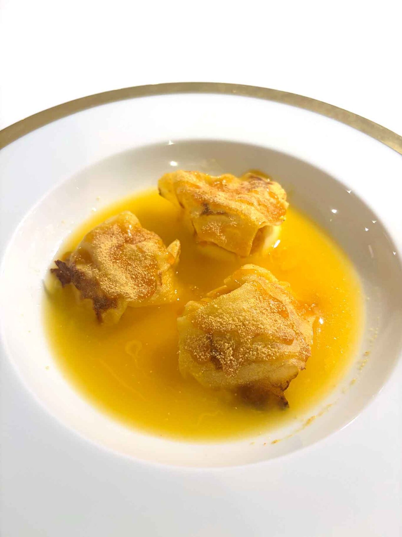 Ravioli di mandorla in brodo di bosco, con il brodo affumicato a mitigare la dolcezza del ripieno di mandorla dei ravioli (55 euro nella porzione in carta).